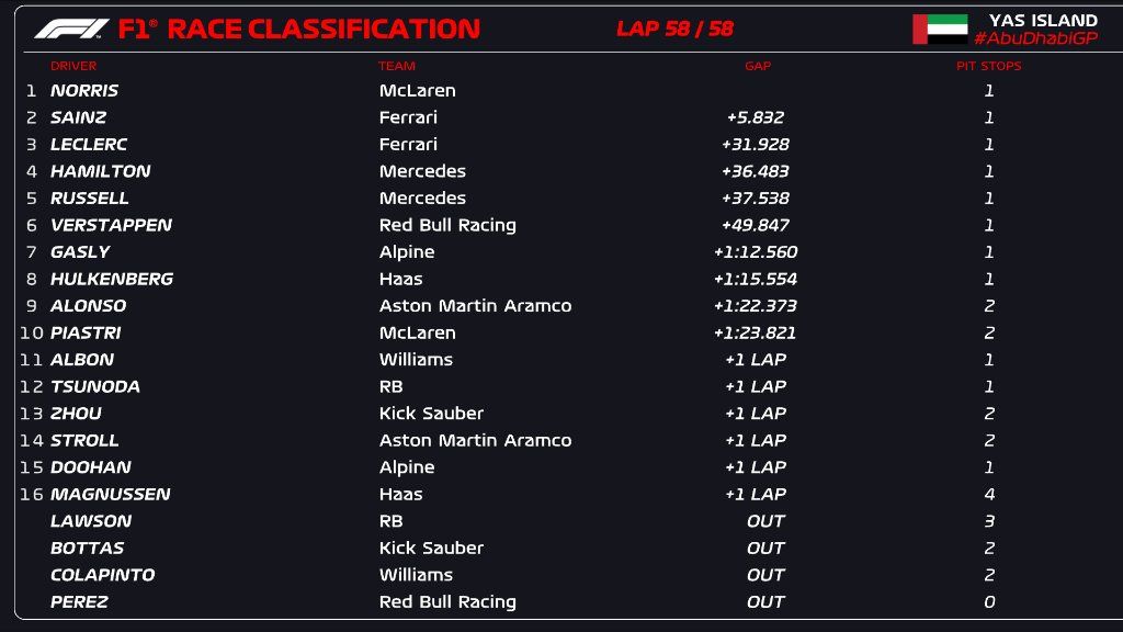 Despite the throw from Ferrari, McLaren took the title by 14 points with Sainz and Leclerc rounding the podium positions in a spirited drive from both. Russell had fourth but not on the final lap when Hamilton cut a 14s gap to secure fourth from his teammate to end his stint with Mercedes.