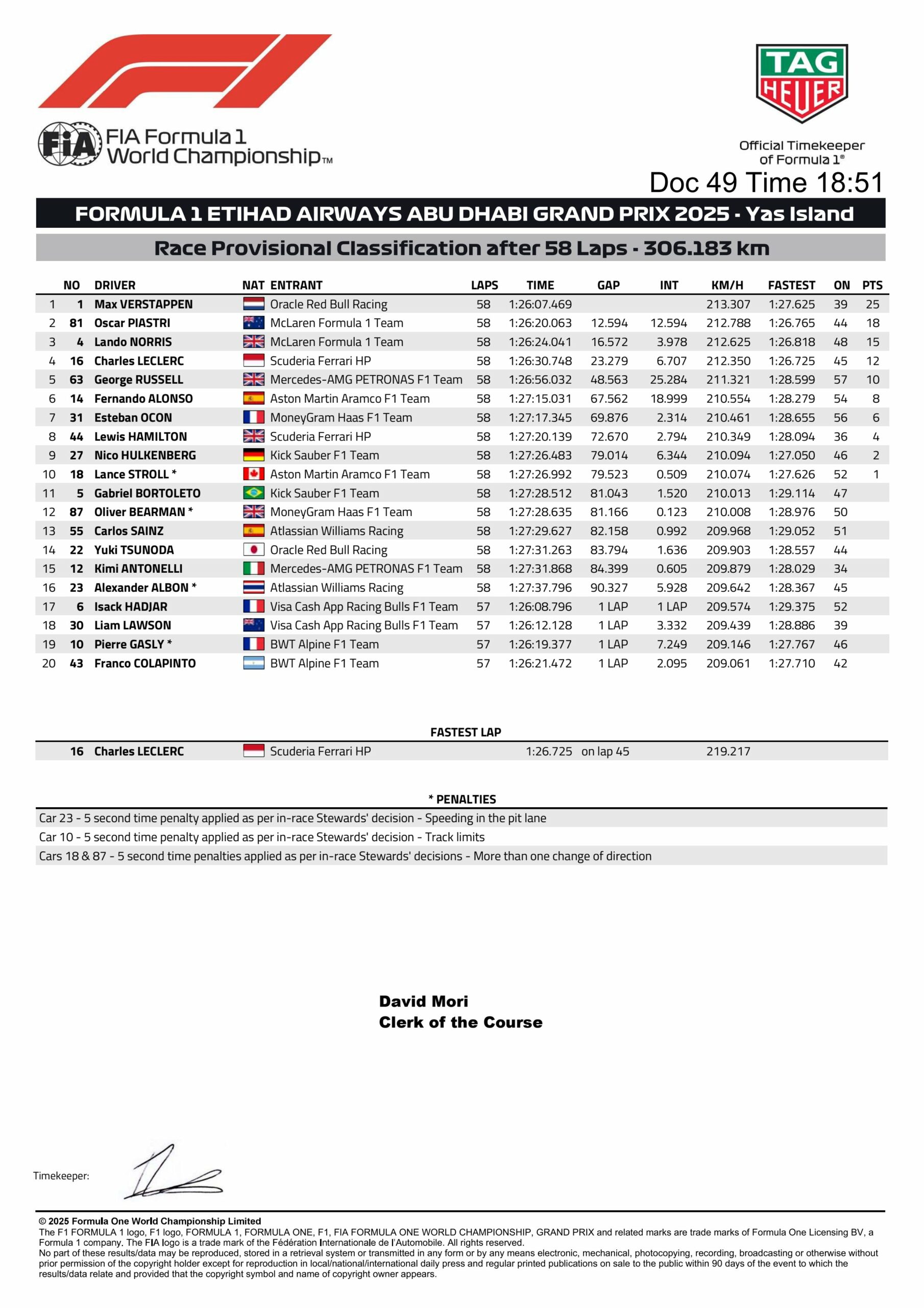 Albon was handed 5s time penalty for speeding in the pitlane. The second stop saw Leclerc do so on Lap 40, with Norris following him to cover him. After Verstappen caught him and passed him on track, Piastri pitted on Lap 42 for his first and potentially the last stop in the grand prix.