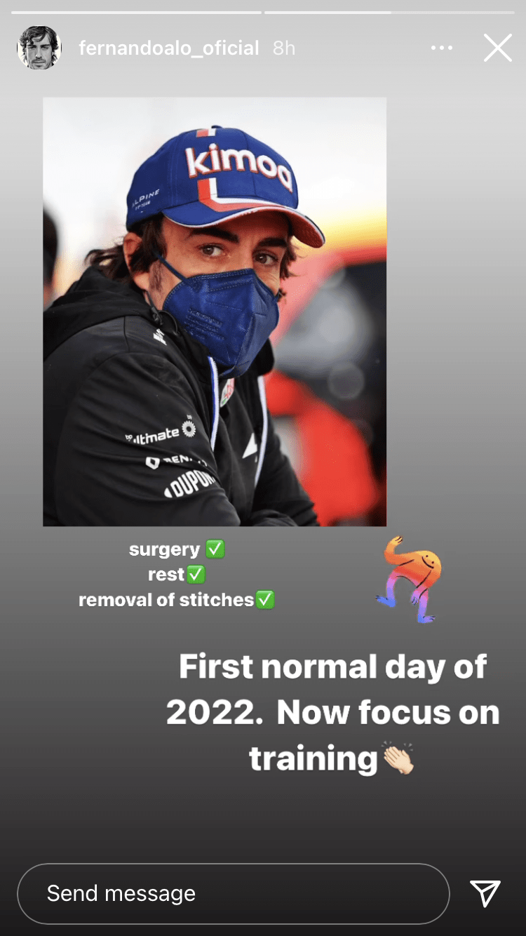 After the Abu Dhabi test, Alonso noted about undergoing a surgery in January and on Tuesday, he revealed of a completed surgery along with the removal of stitches and subsequent rest taken to let it heal. It is now time for full on training for the new season.