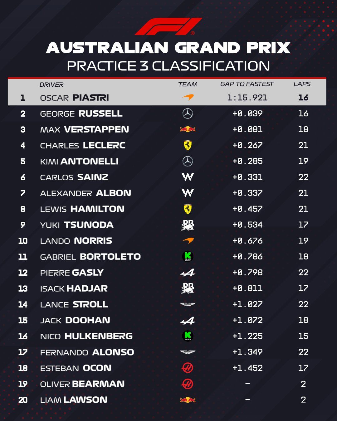 It was not as sunny as Friday for FP3 of F1 Australian GP at Albert Park. It was cloudy conditions as Oscar Piastri put McLaren back on top with a 1m15.921s lap which was only 0.039s quicker than Mercedes’ George Russell, with Red Bull’s Max Verstappen finishing 0.081s aloof the Australian.