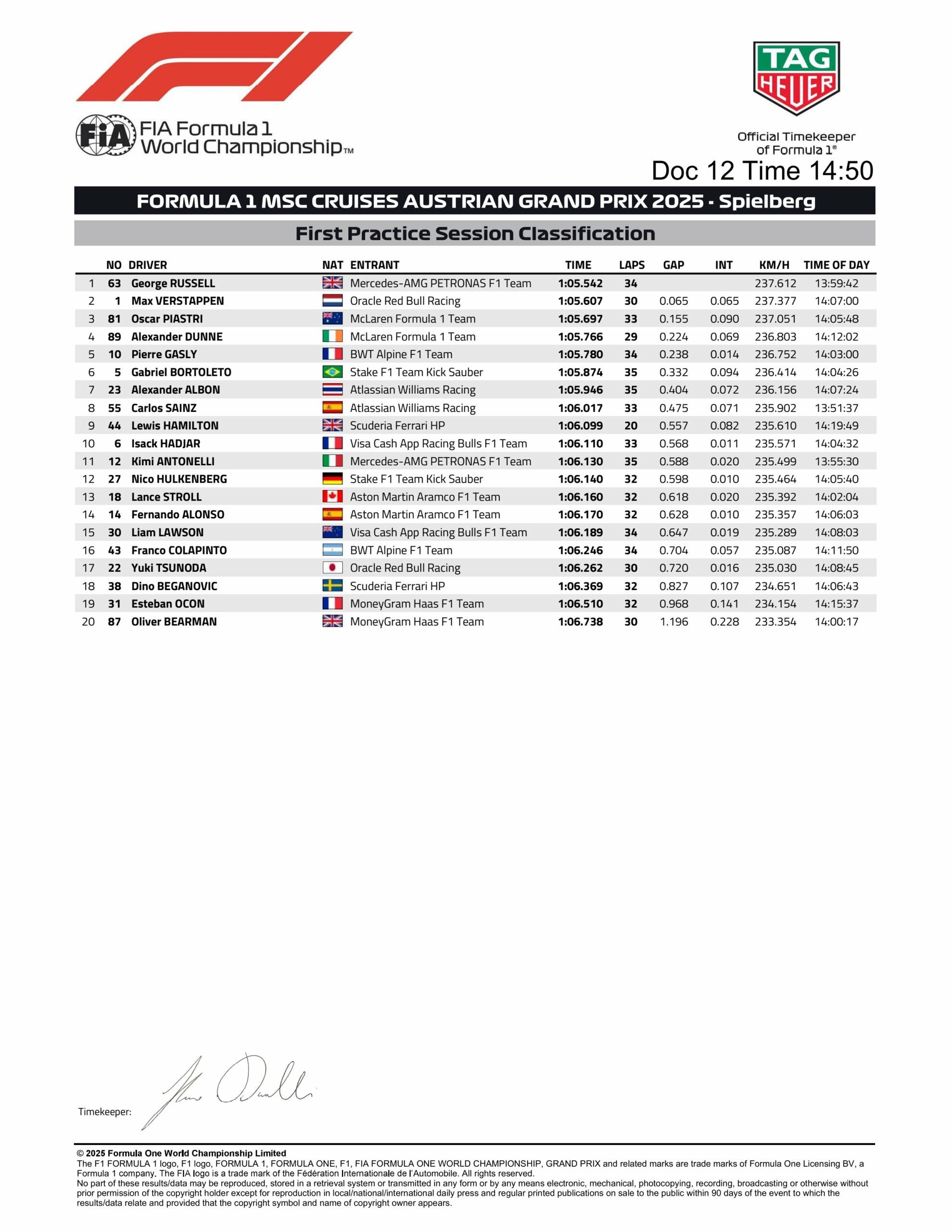 George Russell led the way in FP1 in F1 Austrian GP by a close margin over Max Verstappen and Oscar Piastri, amid a tight field.