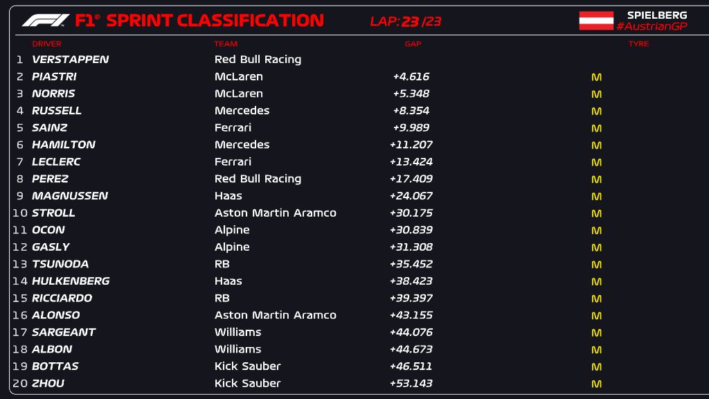 It eventually steadied at the front as Verstappen stretched a small lead to eventually win the F1 Austrian GP sprint ahead of the fighting pair of Piastri and Norris, where the Australian resisted pressure from his teammate to end up second.