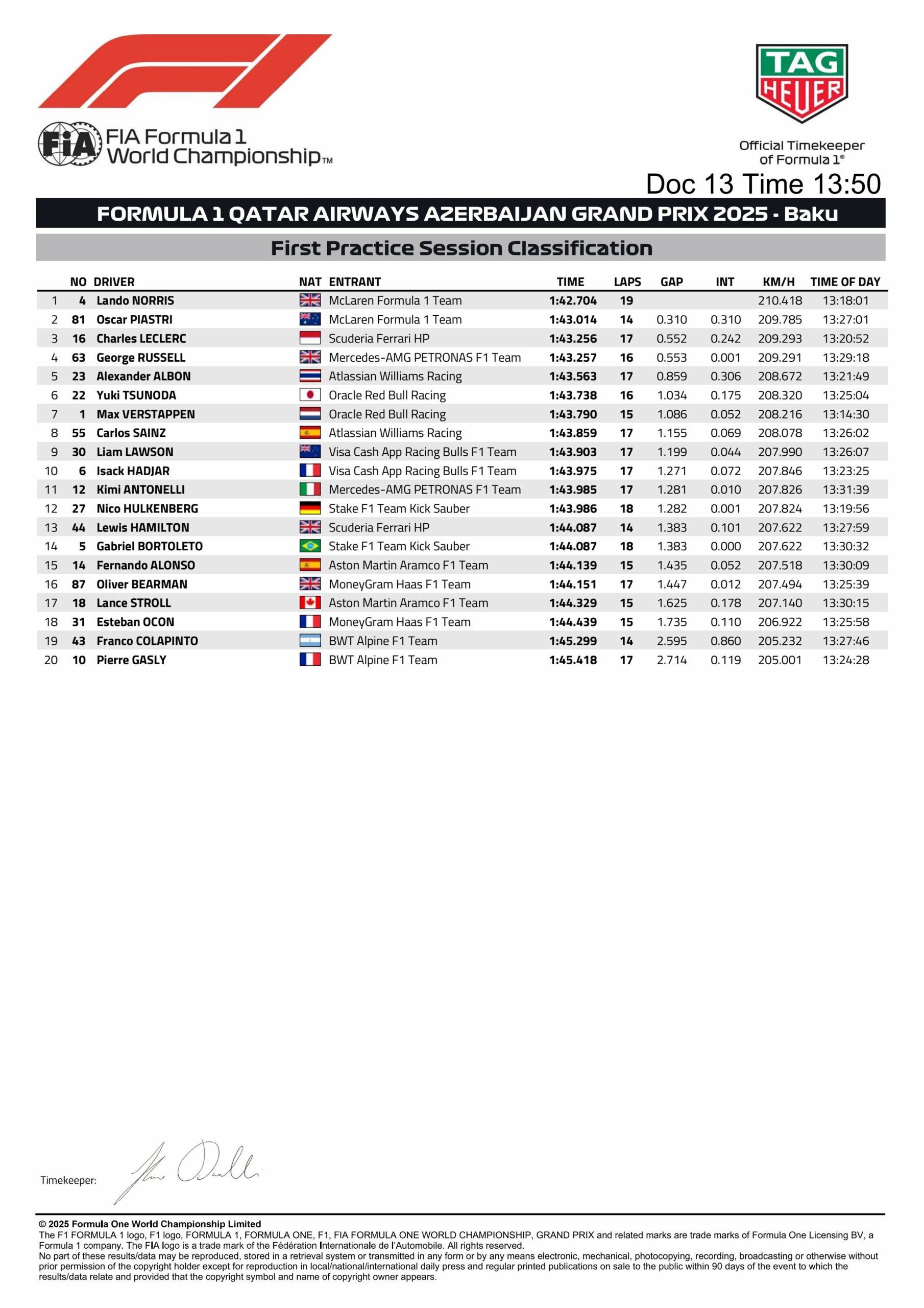 Esteban Ocon completed a positive day for Haas in eighth from Alex Albon, Norris and the second Williams of Carlos Sainz. Piastri finished 12th but was placed under investigation for a yellow flag infringement to be investigated after the session, from Isack Hadjar (Racing Bulls), Yuki Tsunoda (Red Bull) and Gabriel Bortoleto (Kick Sauber). The order was completed by Alpine’s Pierre Gasly, Lance Stroll (Aston Martin), Nico Hulkenberg (Kick Sauber), the second Aston martin of Fernando Alonso and Franco Colapinto, the Alpine driver two seconds off the pace.