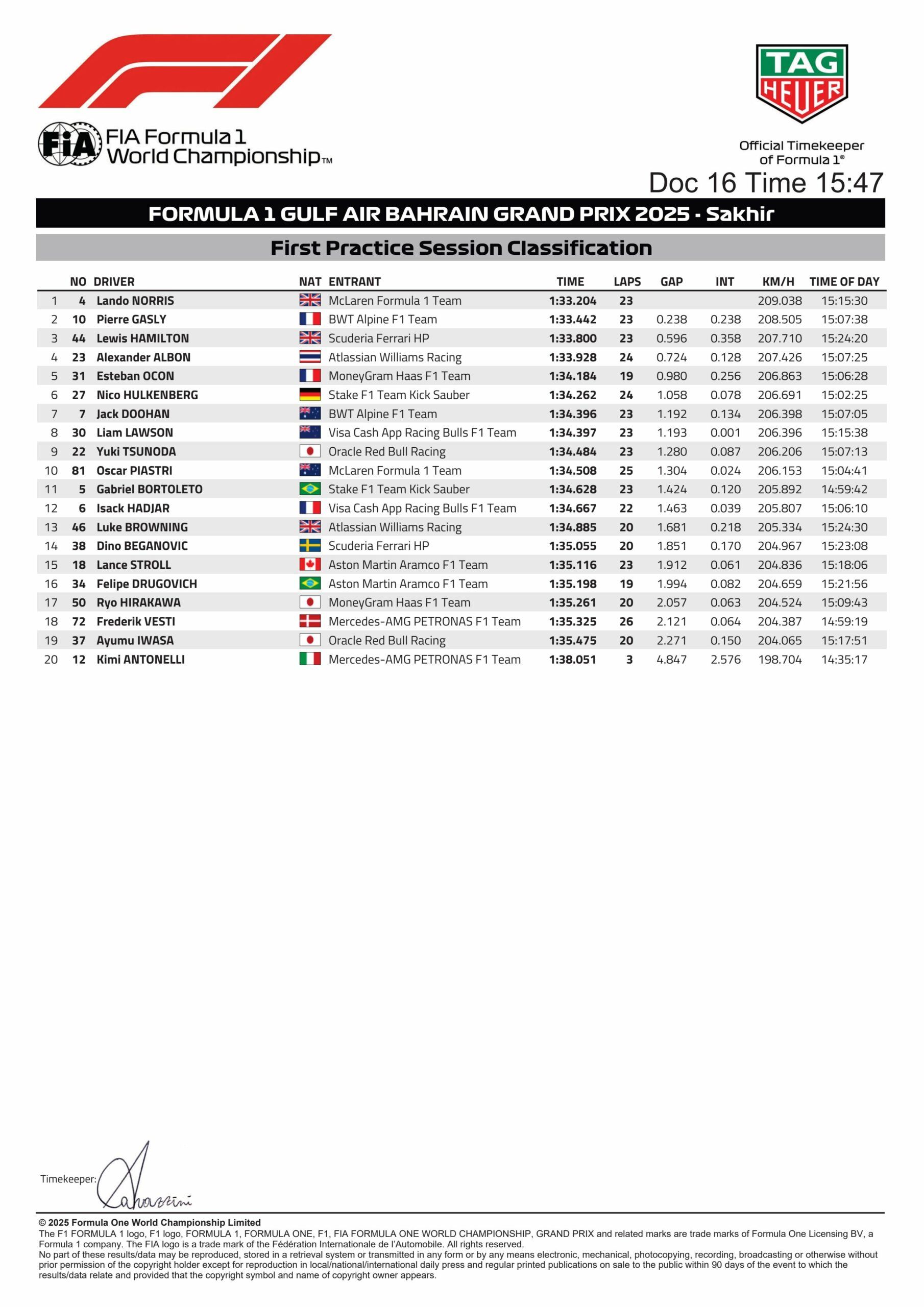 Sauber’s Nico Hulkenberg was sixth from Alpine’s Jack Doohan, with Visa Cash App RB’s Liam Lawson slotting in eighth ahead of Tsunoda and Piastri in the Top 10. Sauber’s Gabriel Bortoleto was 11th from Visa Cash App RB’s Isack Hadjar, as the lead FP1 runner was Browning in 13th after a late push.