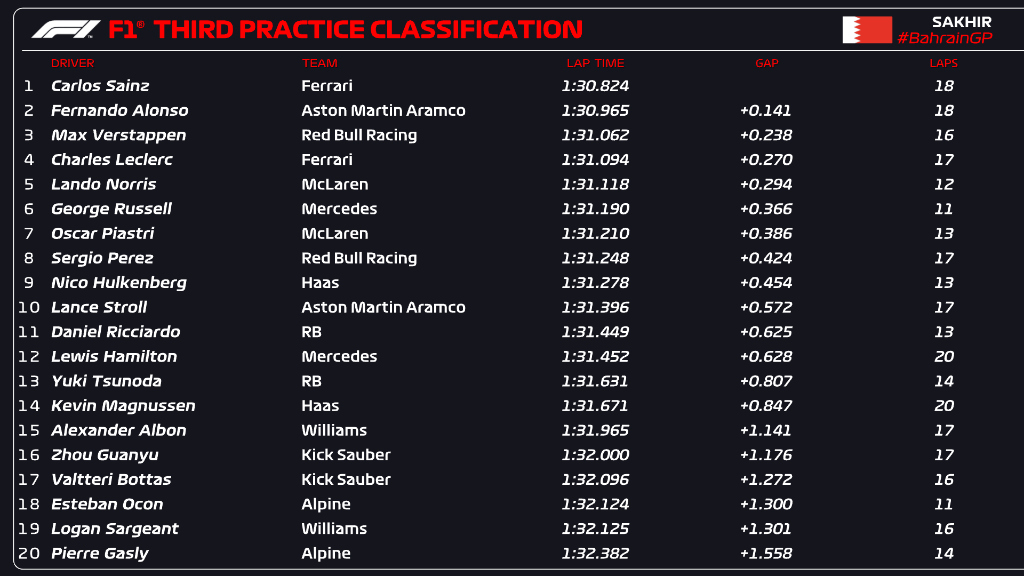 It was back again in daylight for FP3 of F1 Bahrain GP weekend as Ferrari’s Carlos Sainz (1m30.824s) made it three different pace-setters in three practice sessions. He pipped Aston Martin’s Fernando Alonso (1m30.965s) after a late quick lap.