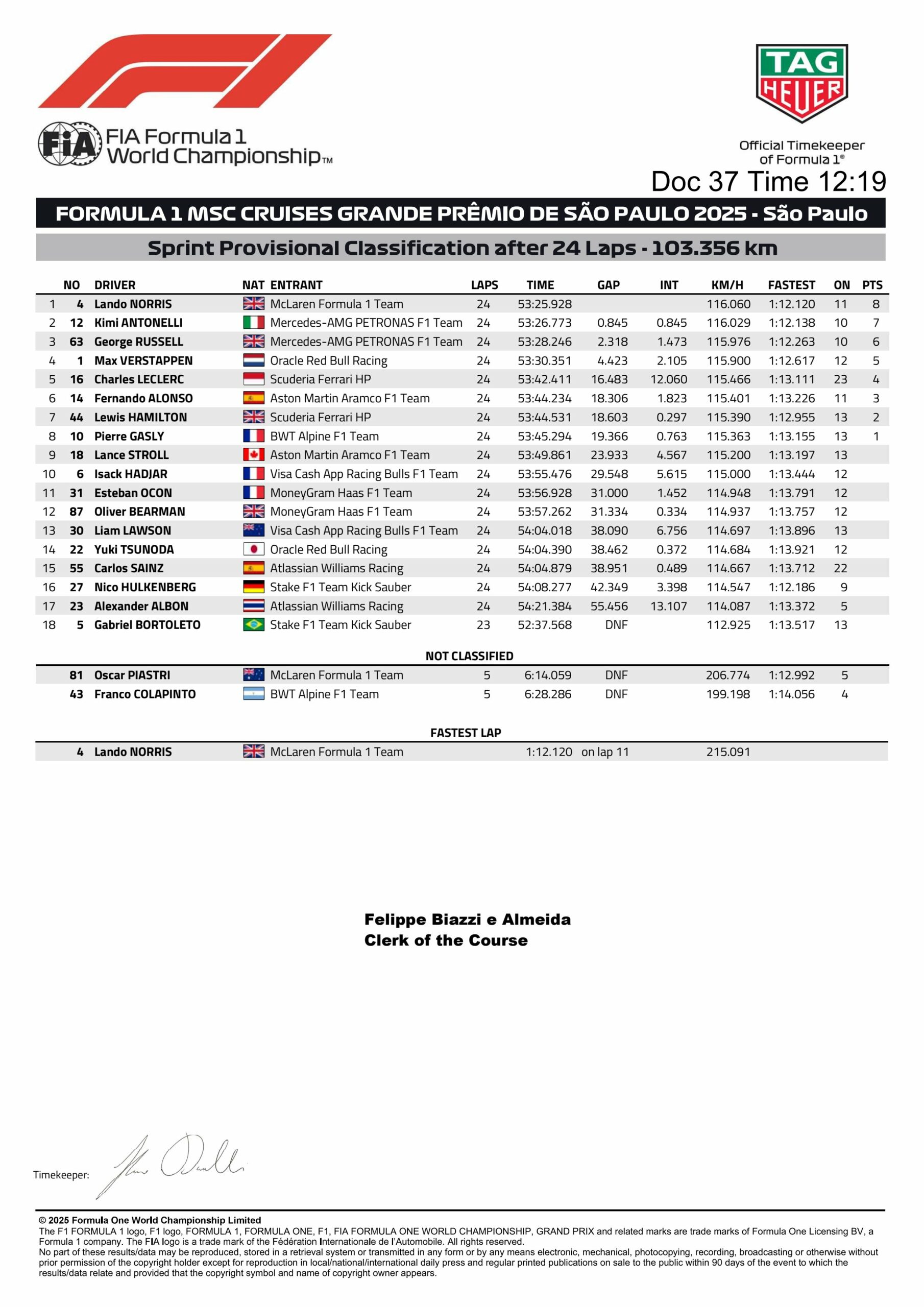 Gasly too managed to get through Stroll for the final point on the lap behind. It was a win for Norris in F1 Brazil GP sprint under double yellow flags, as he stretched a points lead against Piastri in the title battle. Antonelli had to be content for second, with Russell in third and Verstappen fourth.