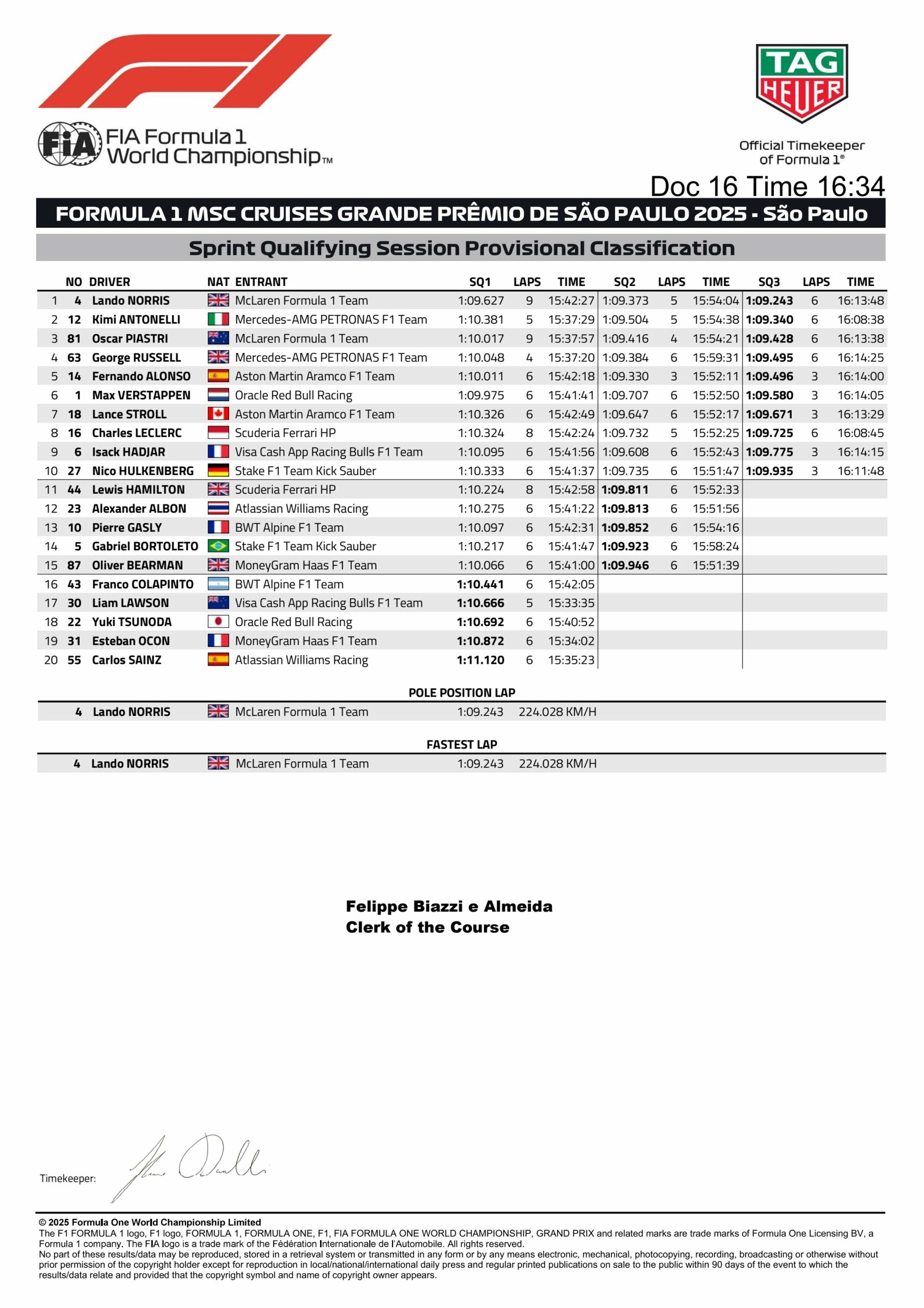 The final part in F1 Brazil GP sprint qualifying saw mandated run on the soft compound as Norris led the way with a 1m09.271s lap ahead of Mercedes pair of Antonelli (1m09.340s) and Russell (1m09.556s) in the Top 3, as Piastri’s Turn 1 mistake cost him to be only fourth.
