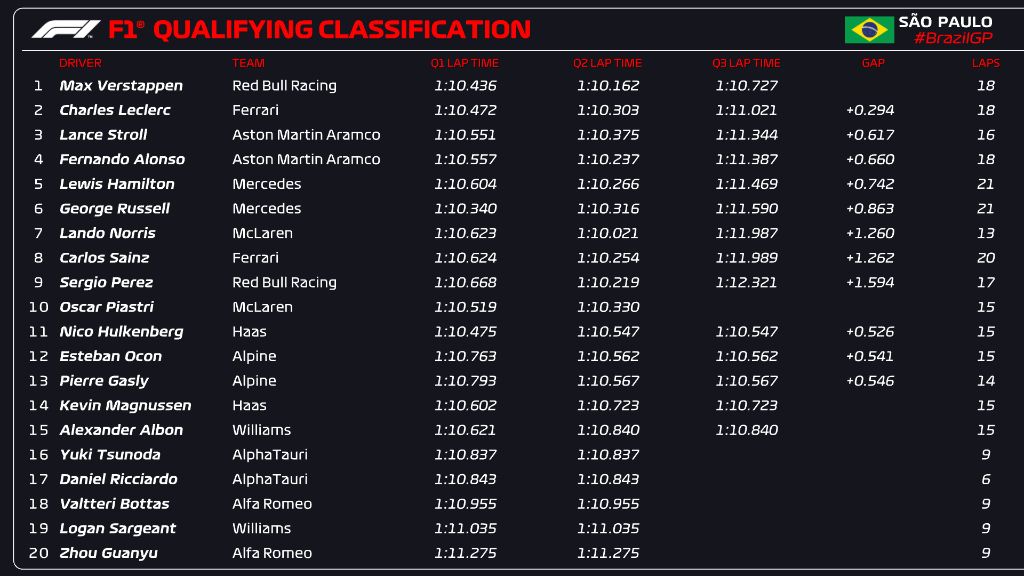 Verstappen led the way with a 1m10.727s lap which was enough to secure F1 Brazil GP pole for Sunday’s race as rain arrived with about five minutes to go and ended the session early. Leclerc was second with a 1m11.021s with Aston Martin’s Lance Stroll third.