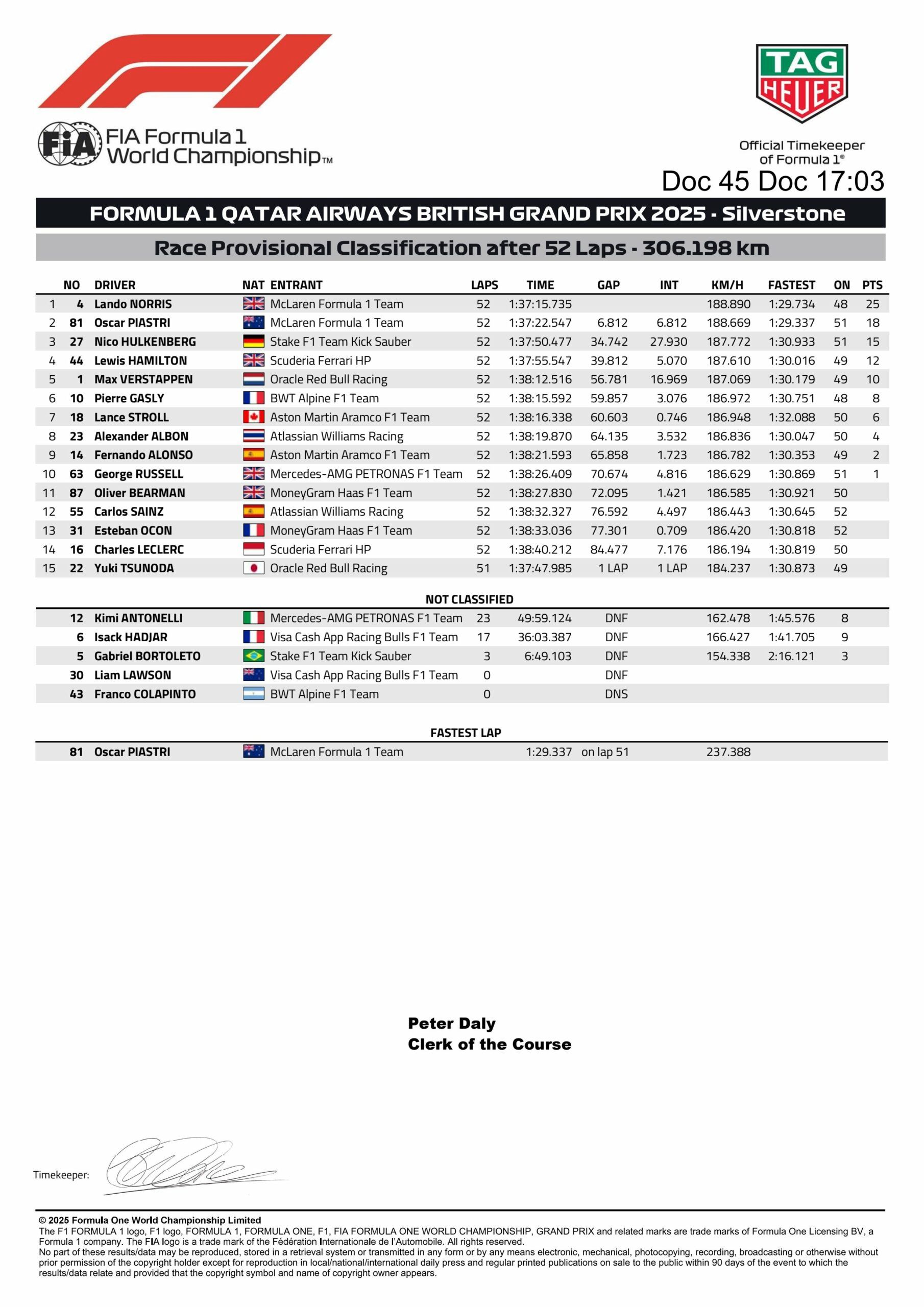 The Monegasque had another gravel moment to drop further back in the order. McLaren informed Piastri about no team orders. It was straight fight and Norris eventually took the F1 British GP win from Piastri, as Hulkenberg finally secured his first podium in 239 starts after coming through from 19th.
