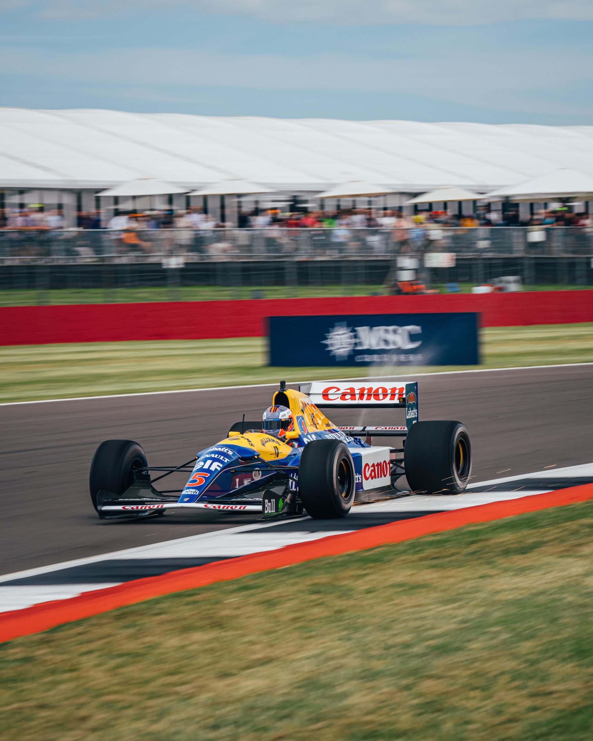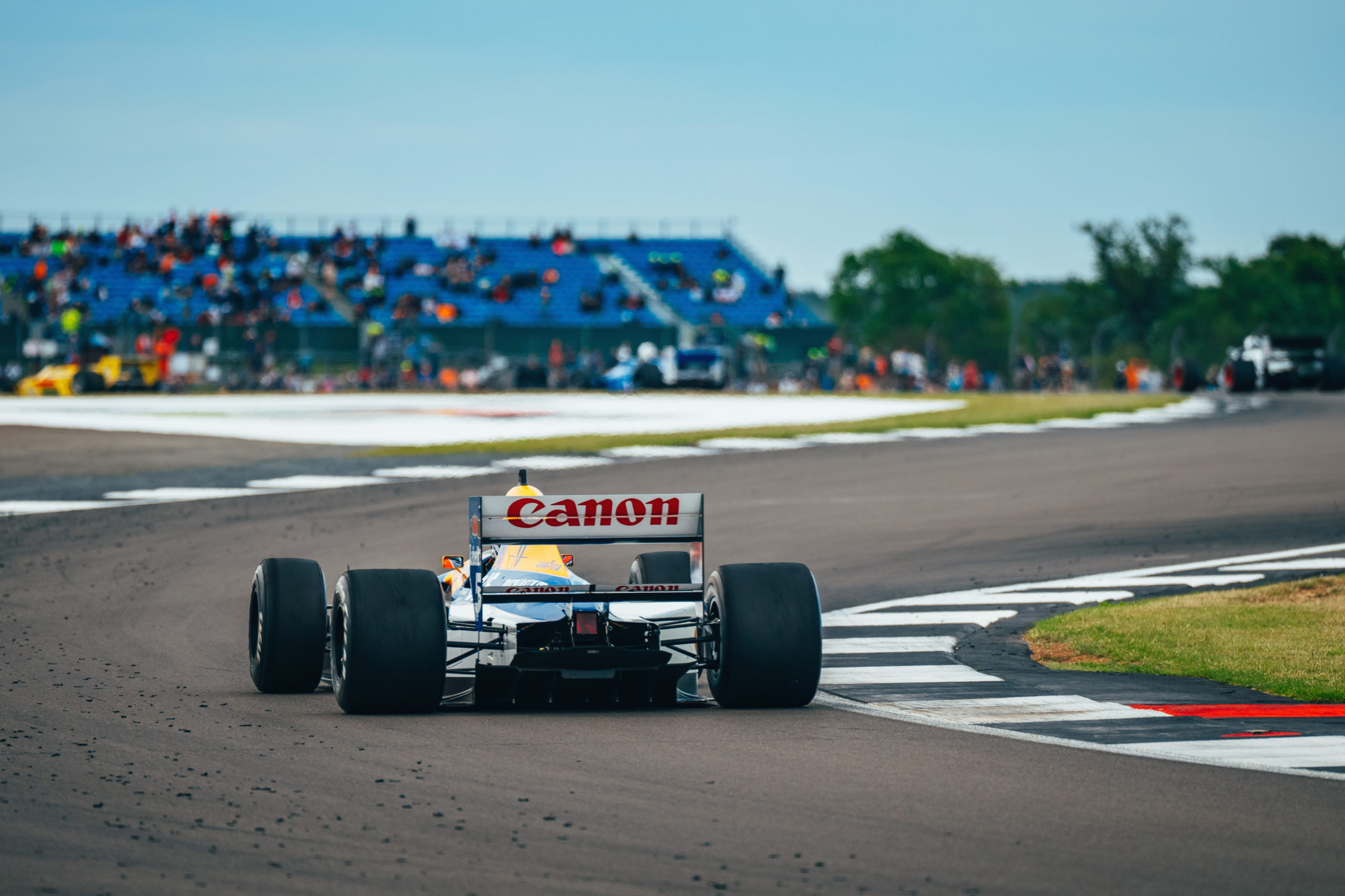 Jenson Button drives Nigel Mansell’s Williams FW14B F1 car at Silverstone ahead of British GP race as part of 800th grand prix celebrations.