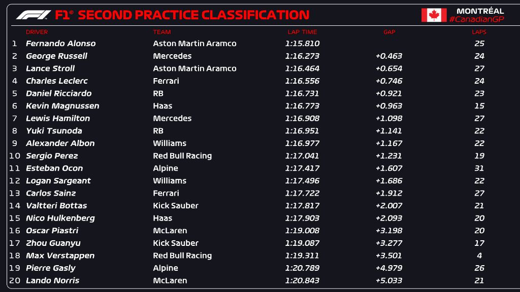 Fernando Alonso led the way in FP2 of F1 Canadian GP ahead of George Russell and Lance Stroll before the rain arrived to disrupt running.