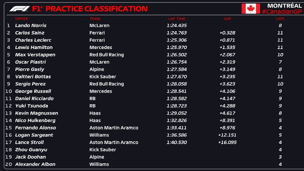 Lando Norris set the pace in FP1 of F1 Canadian GP after rain delay, as Carlos Sainz and Charles Leclerc rounded the Top 3.