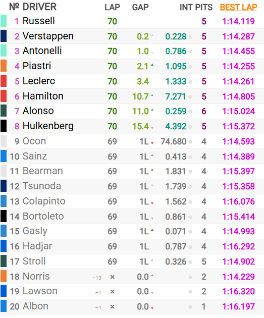 Visa Cash App RB’s Liam Lawson was forced to retire to save his power unit. At the front, Russell had to respond to Verstappen’s inroads, as Antonelli had to fend off Piastri and Norris in the battle for third. It turned into a disaster for the Brit in the end after a collision with the Australian.
