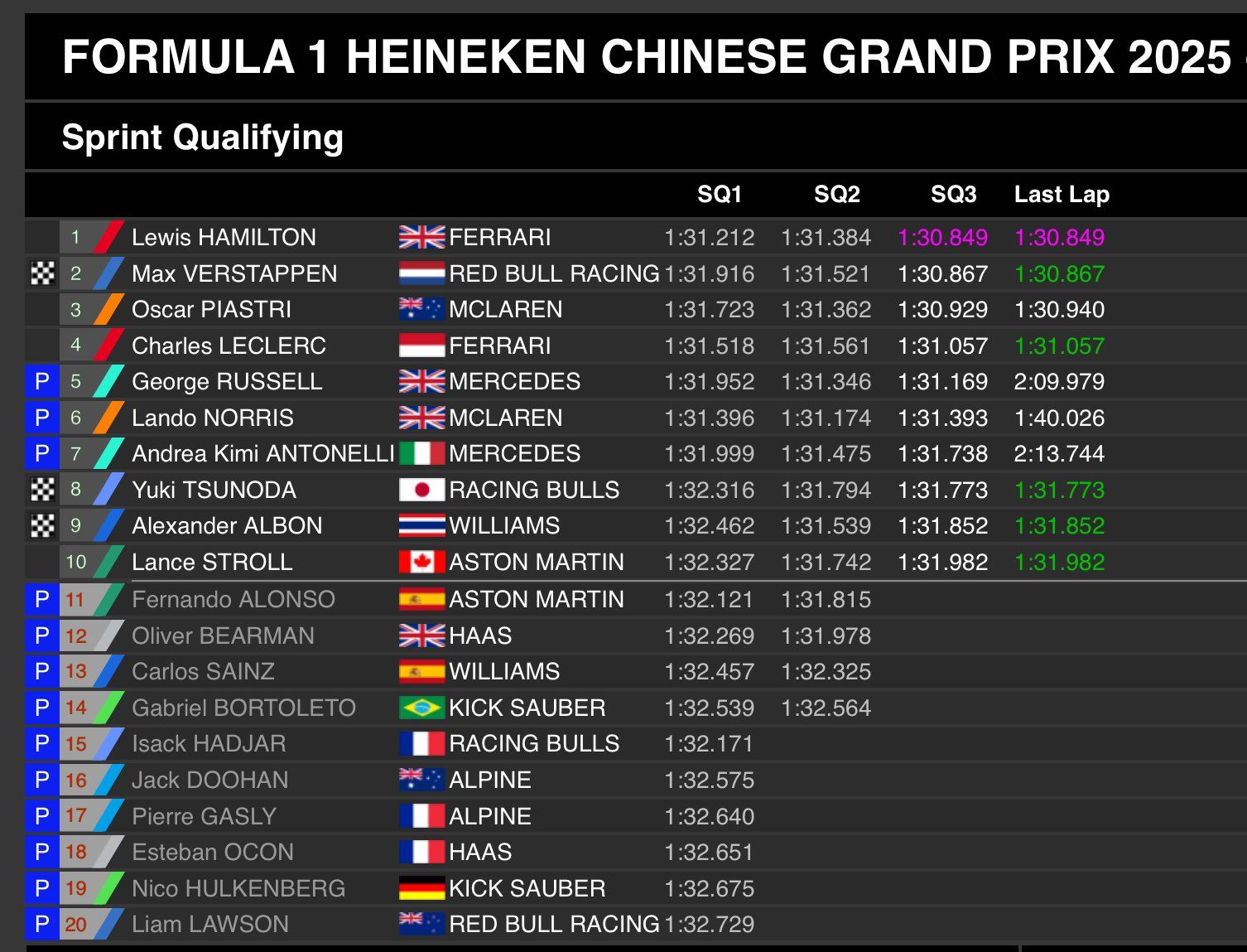 This allowed Hamilton (1m30.849s) to take the top spot with a 0.018s margin over Verstappen (1m30.867s). The Brit had his first F1 sprint pole with Ferrari in Chinese GP. The two demoted Piastri (1m30.929s) to third, who was only 0.080s behind the pole-sitter.