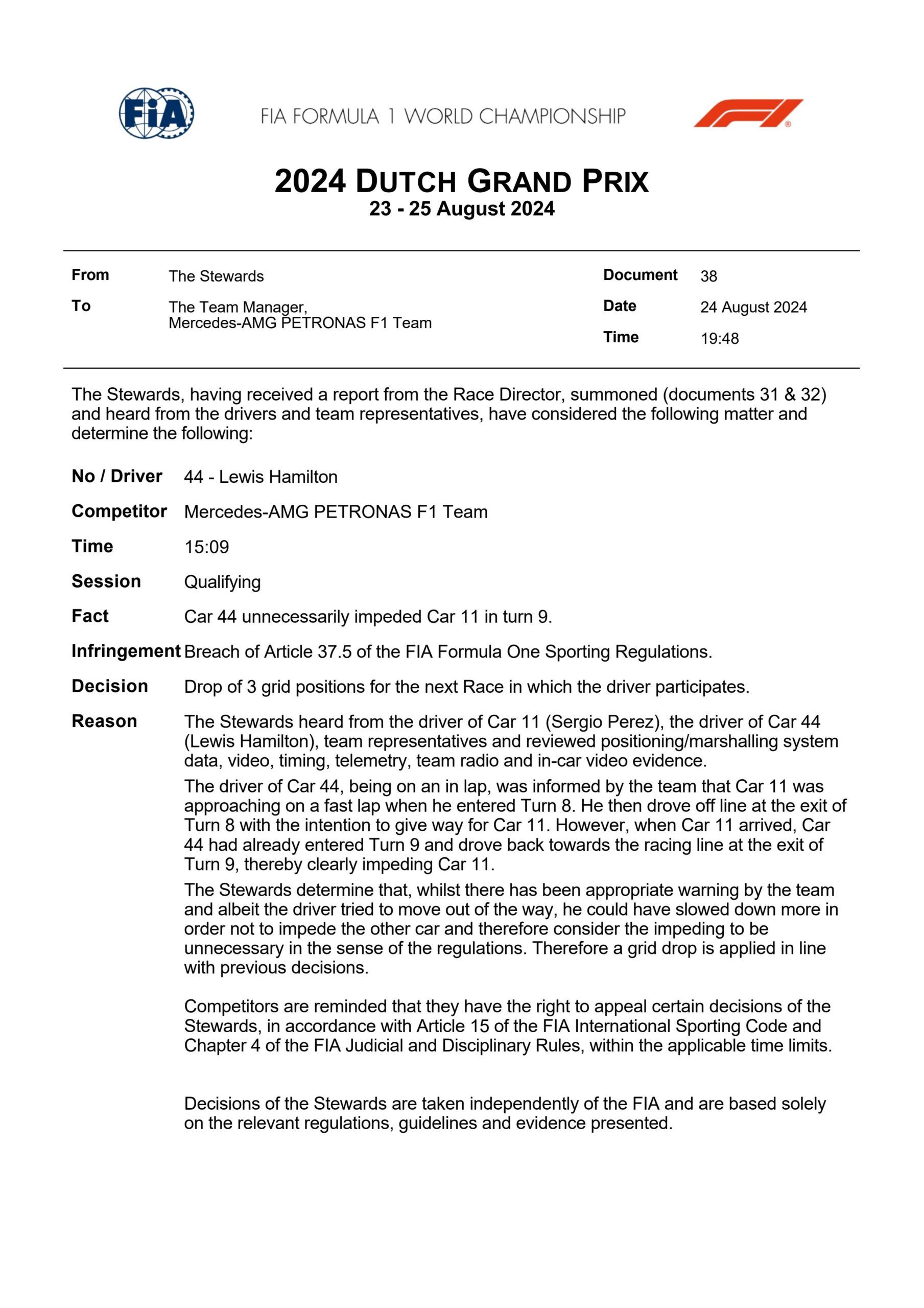 Also, Sargeant has been cleared to race despite not taking part in qualifying. Here: https://www.fia.com/sites/default/files/decision-document/2024%20Dutch%20Grand%20Prix%20-%20Decision%20-%20Car%202%20-%20107%25%20Time.pdf