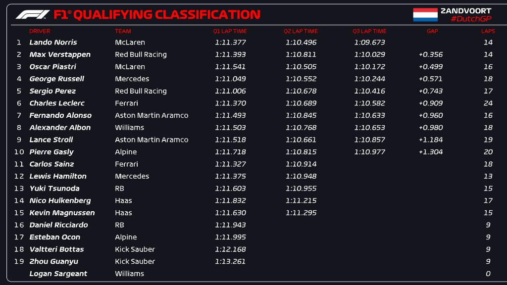 The final part of F1 Dutch GP qualifying saw early laps for the front-runners where Norris set the pace to have provisional pole with a 1m10.074s lap ahead of Piastri (1m10.193s) and Red Bull’s Max Verstappen, with Russell and Leclerc following in the Top 5.