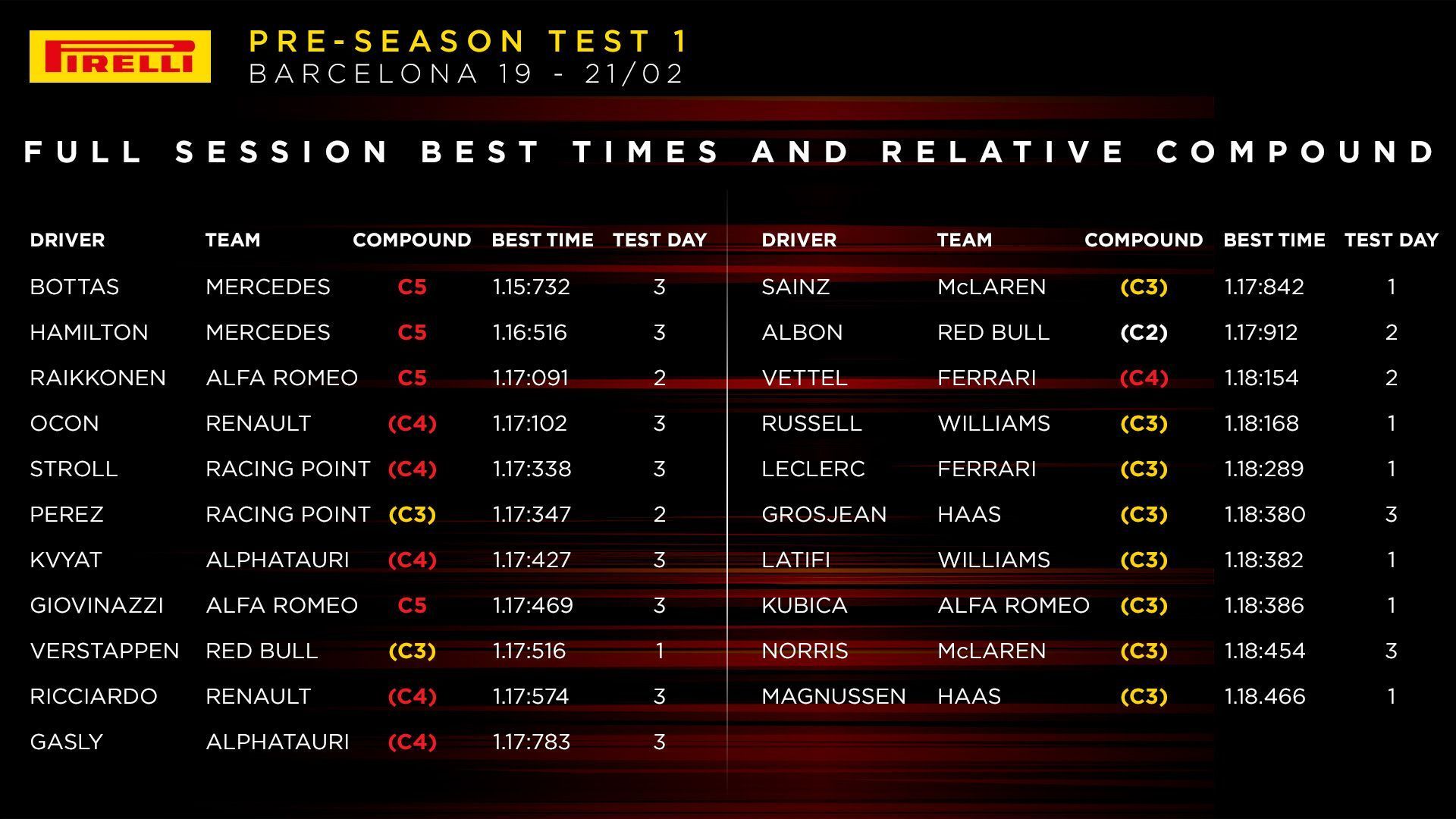 Aside the news and stories, the main thing to watch out among teams is the lap count as mileage is crucial not only for the F1 outfits but also the drivers and engine manufacturers. The less number of test days makes any small issue seem much bigger.