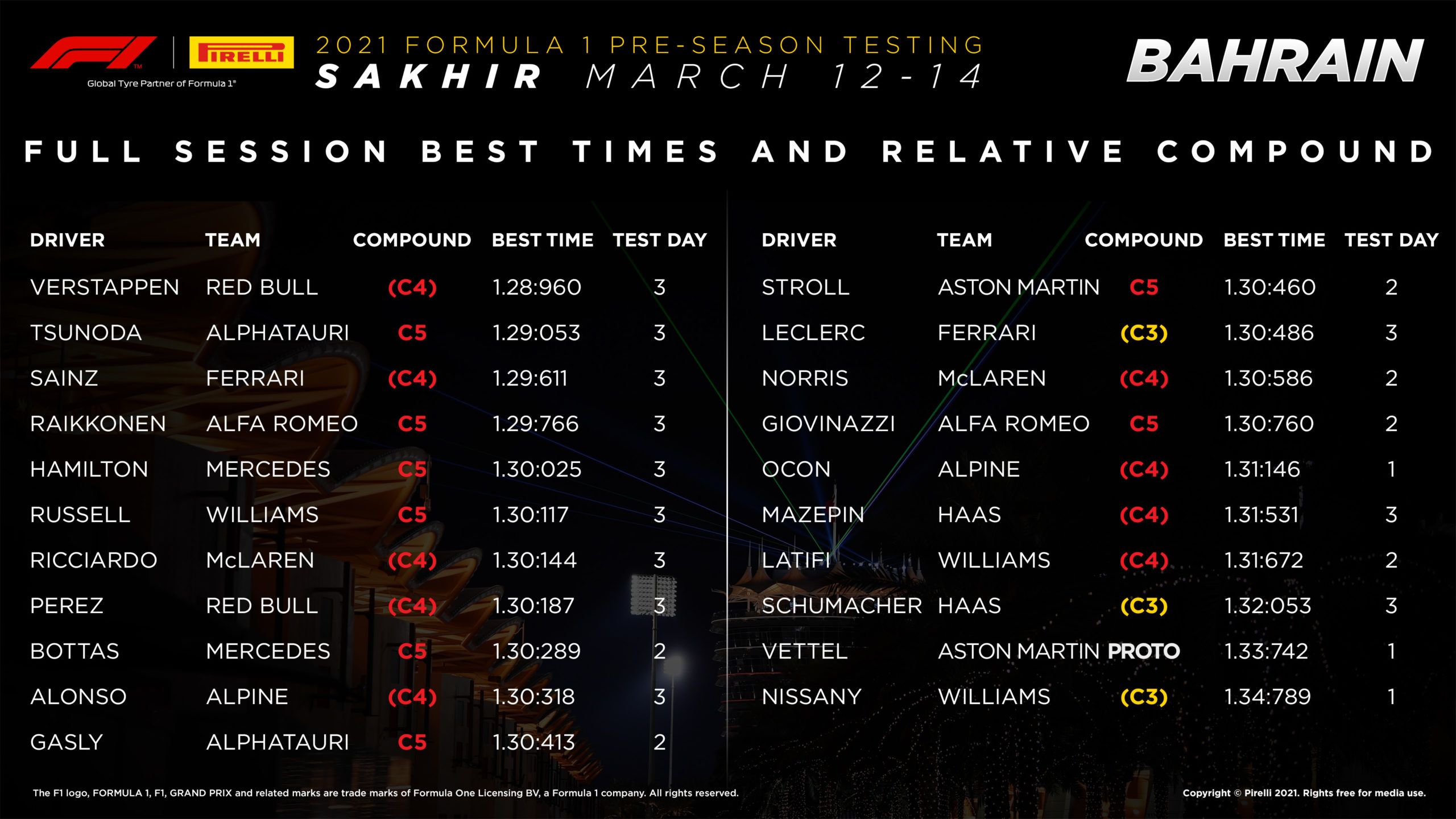 The lone F1 pre-season test is in the books at Bahrain International Circuit, where reigning world champions ended up at the bottom.
