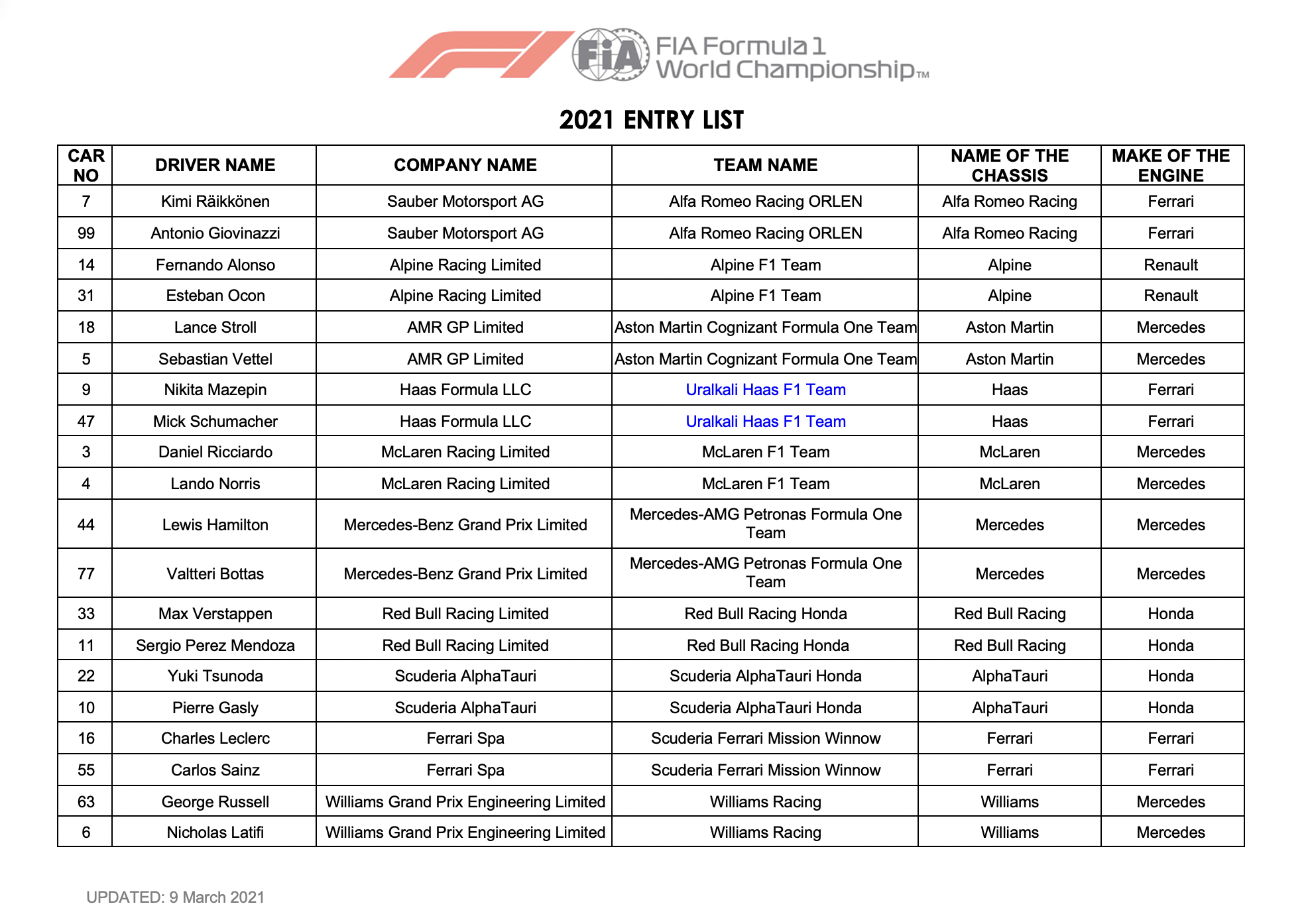 FIA F1 2021 Official Entry List – March 9 (Last Updated):