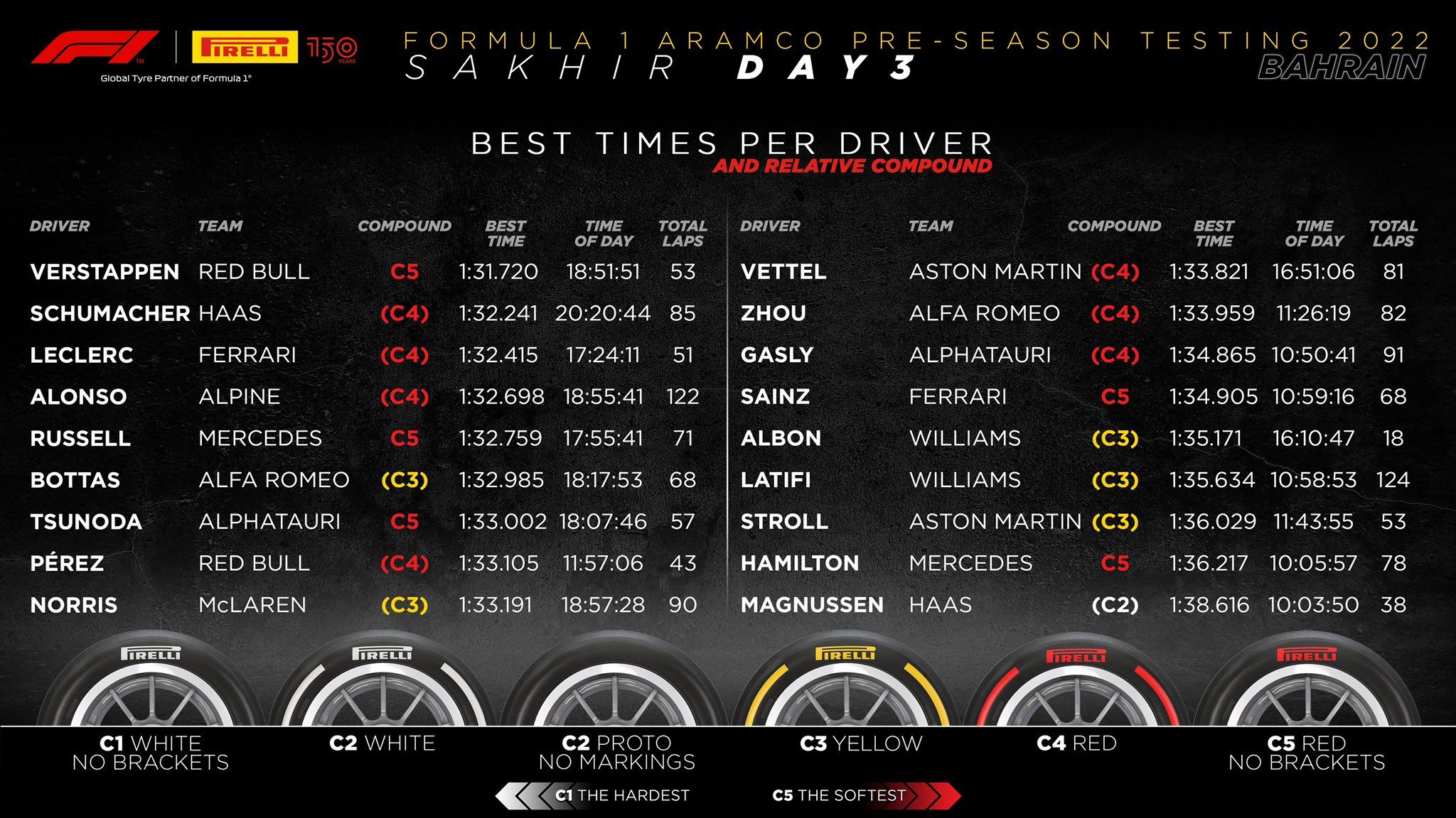 He managed more laps after the team brought in new parts to fix the cooling/brakes issues. Alfa Romeo’s Zhou (1m33.959s, C4, 82) was 11th from AlphaTauri’s Gasly (1m34.865s, C4, 91) and Ferrari’s Carlos Sainz (1m34.905s, C5, 68) – all of whom ran in the morning hours.