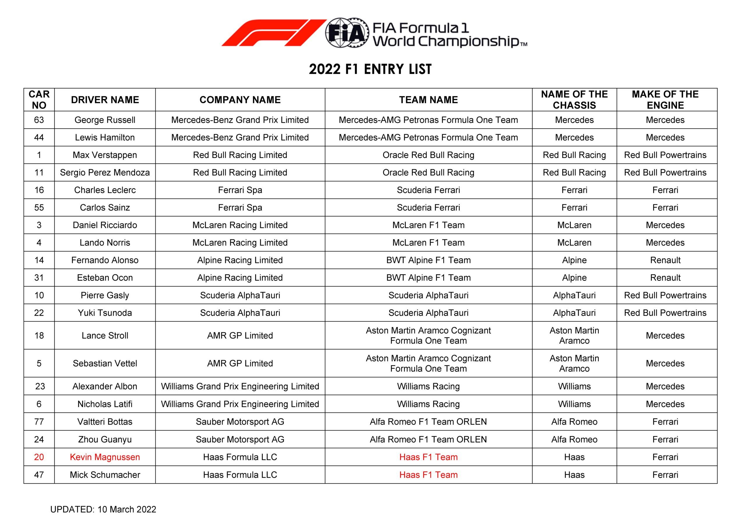 FIA F1 2022 Official Entry List (Updated on March 10, 2022):