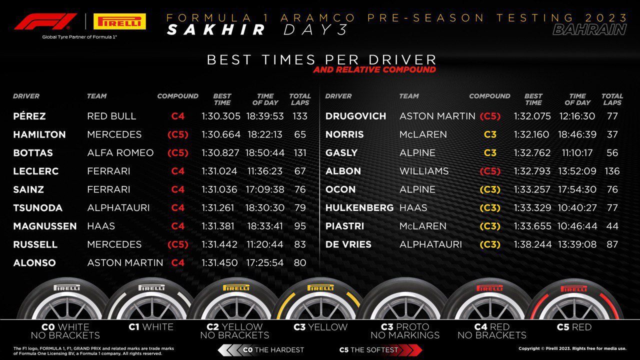 The final day of F1 2023 Bahrain pre-season test saw Red Bull back on top wit Perez this time after a C4 lap of 1m30.305s, as he headed Mercedes’ Hamilton and Alfa Romeo’s Bottas – where both of them set their best on the C5 compound.