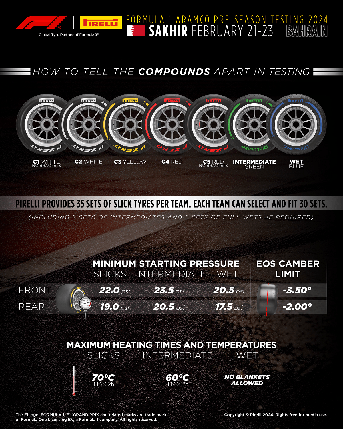 In terms of the driver line-up, there are no changes at all from the end of 2023 season to 2024. In terms of tyres, Pirelli will have C1, C2, C3, C4 and C5 compound available as the C0 that was introduced last year is removed from usage.