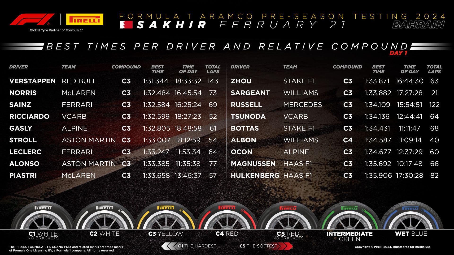 The three-day F1 2024 pre-season test kicked-off in Bahrain where Red Bull’s Verstappen set the pace after a full day running for the Dutchman. He set a 1m31.344s lap on the C3 compound, completing a mammoth 142 laps in all.