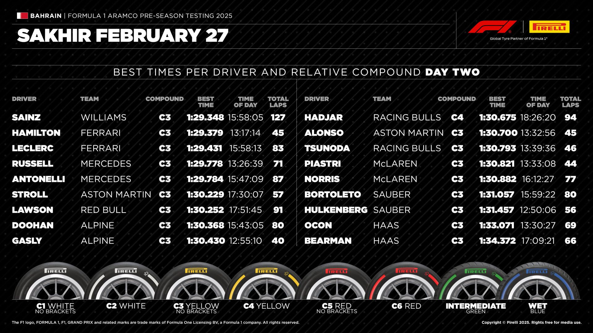 Lewis Hamilton: “It’s been another positive day for us in Bahrain. We’re making strong progress in understanding the SF-25 and learning how to get the most out of it, and the reliability is good so far which is a really positive sign. We didn’t get to do as much running as we hoped because of the weather, but we have more time on track tomorrow to work through our programme and to build even more comfort in the car. I’m really enjoying working with the team and we’re all looking forward to the final push tomorrow.”
