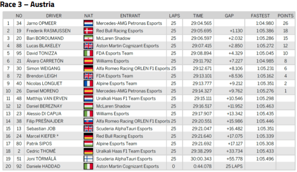 The third and final race took place in a wet Austria where Opmeer led nicely to make it a double ahea dof Red Bull’s Frederik Rasmussen, with McLaren’s Boroumand in the Top 3 from Blakeley and Ferrari’s David Tonizza, as Williams, Alfa Romeo and Alpine scored points.