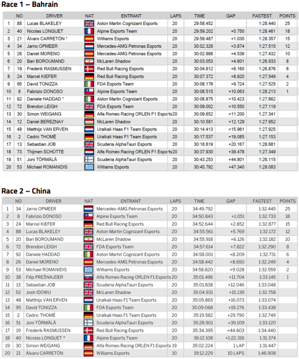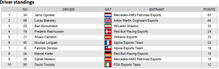 Opmeer managed to resist Donoso to win, as Red Bull’s Marcel Kiefer rounded out the Top 3 from Blakeley and McLaren’s Boris Boroumand in the Top 5. The likes of Ferrari, Williams and Alfa Romeo were other point scorers in the Top 10.