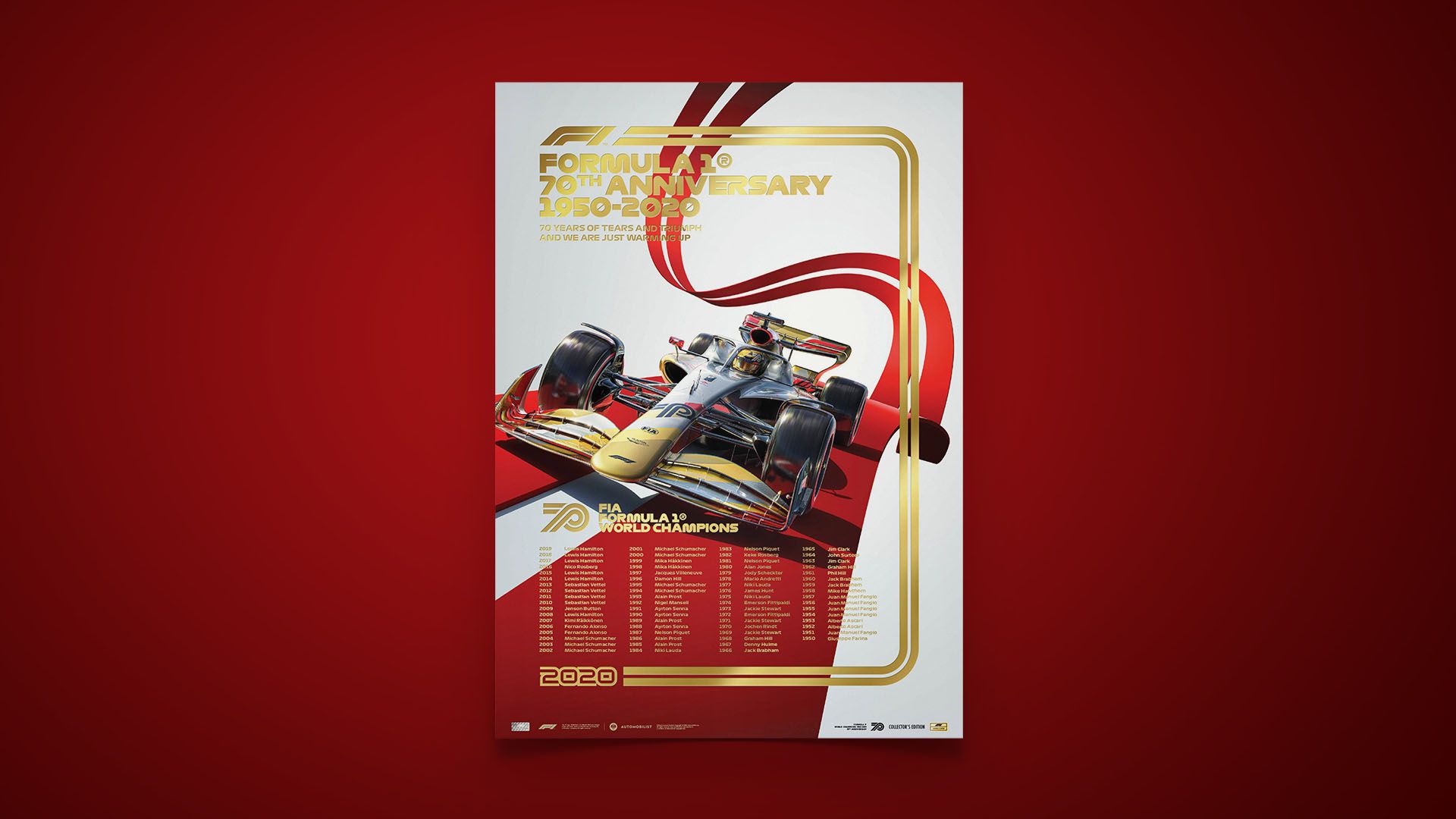 - Collectors’ Edition Poster: In a more limited production of only 700 pieces, the Collector’s Edition Poster blends the past – with all World Champion drivers since 1950 listed out on the poster, the future – a rendering of the Formula 1car in the next few seasons, based on the new technical regulations, and the present – a commemoration of 70 years etched out in golden embossing.