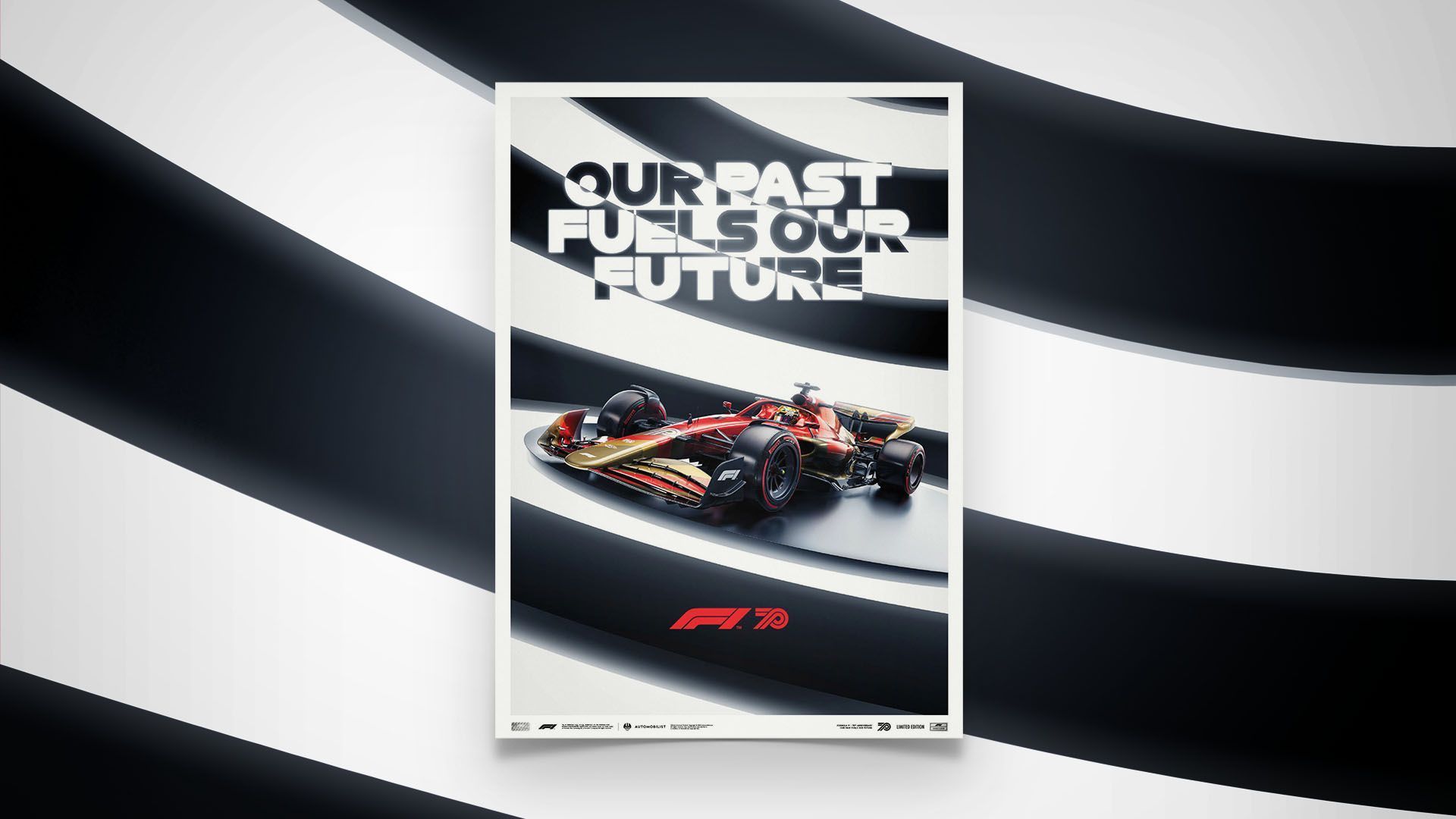 - Limited Edition Poster: A celebration of the fact “Our Past Fuels Our Future”, featured on the poster is the car of the future – a rendering of the Formula 1 car in the next few seasons, based on the new technical regulations – on a retro black and white background symbolic of the racing tracks and the aspired for, chequered flag. As a tribute to the first year of racing – the year 1950 – only 1950 exclusive pieces are printed for the occasion.