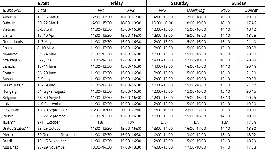Full race schedule of the 2020 F1 season – includes altered times (all local time):
