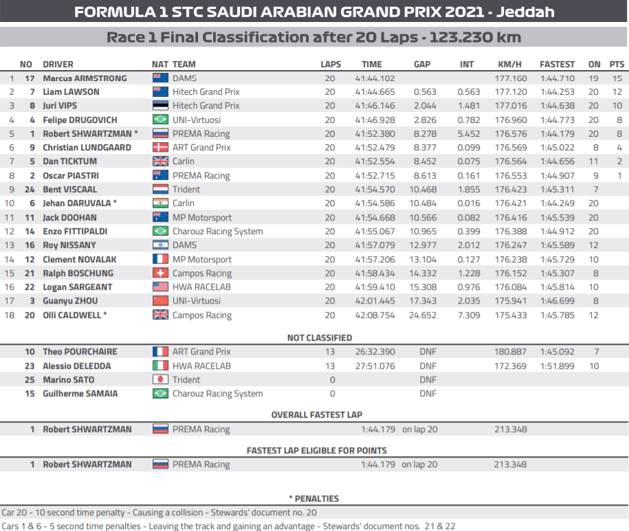 UPDATE: Daruvala was handed a 5s penalty post-race for cutting a corner and gaining an advantage while passing Ticktum. As a result he dropped out of points to 10th with Shwartzman, Lundgaard, Ticktum, Piastri and Viscaal gaining a place each.