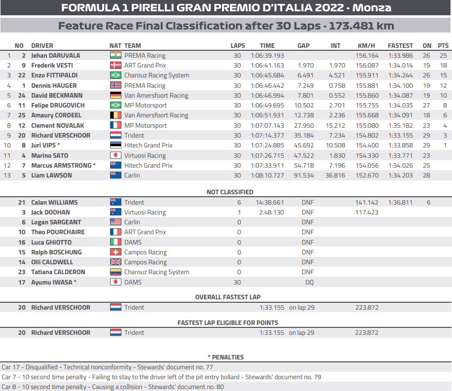 #F3 #ItalianGP That's a bit of an anticlimax. The race will not be resumed. During the red flag, tracklimit penalties are thrown like skittles. Victor Martins, at the end, becomes 2022 CHAMPION !! Here's the end result of the red flagged Feature Race. #MsportXtra pic.twitter.com/CcQRh7Vrbl