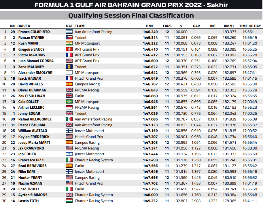 Race 1 grid, Top 12: O’Sullivan, Bearman, Vidales, Hadjar, Smolyar, Maloney, Correa, Martins, Saucy, Maini, Stanek, Colapinto