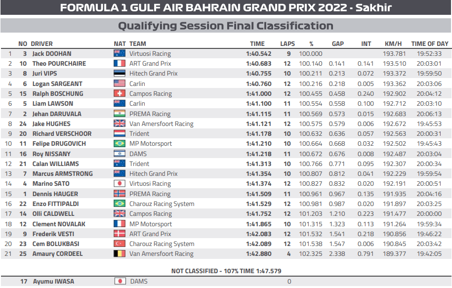 Jack Doohan took pole position for the first feature race of the 2022 F2 season at the Sakhir circuit, with Franco Colapinto doing so in F3.