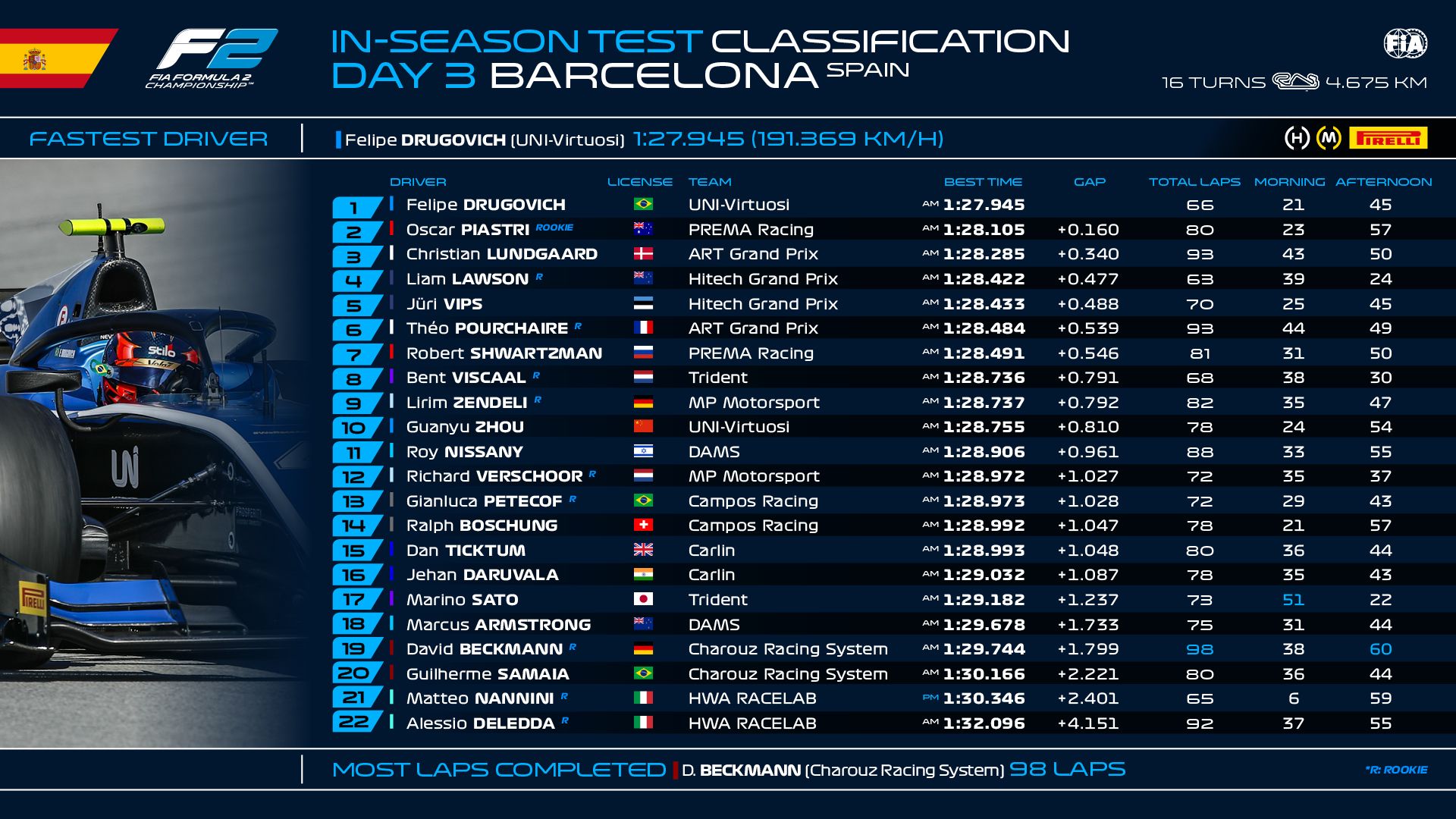 UNI-Virtuosi Racing’s Felipe Drugovich was fastest to end the Formula 2 (F2) test in Barcelona from Prema’s Oscar Piastri.