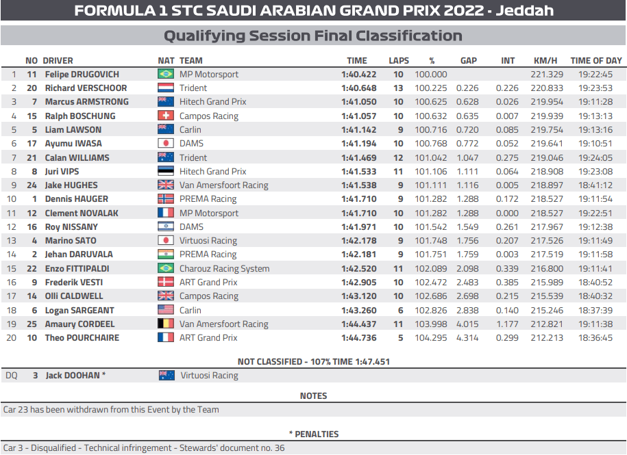 With the penalties applied after the Top 10 is reversed in sprint race, the grid will be: Hauger, Hughes, Williams, Iwasa, Lawson, Vips, Boschung, Armstrong, Verschoor, Drugovich, Nissany, Sato, Daruvala, Fittipaldi, Novalak, Sargeant, Vesti, Pourchaire, Caldwell, Cordeel, Doohan.