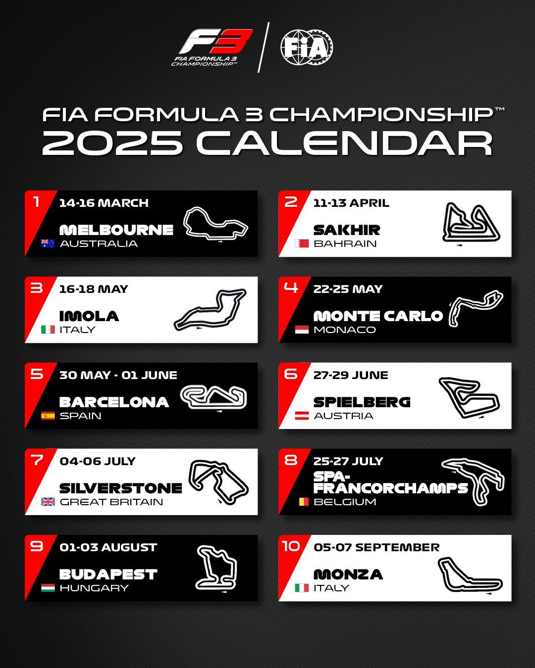 FIA Formula 3 has announced today the calendar for the 2025 FIA Formula 3 Championship. Next season will consist of a total of 10 rounds again, all support events of the FIA Formula One World Championship and the FIA Formula 2 Championship. The 10 teams and 30 drivers will contest a total of 20 races across three continents.