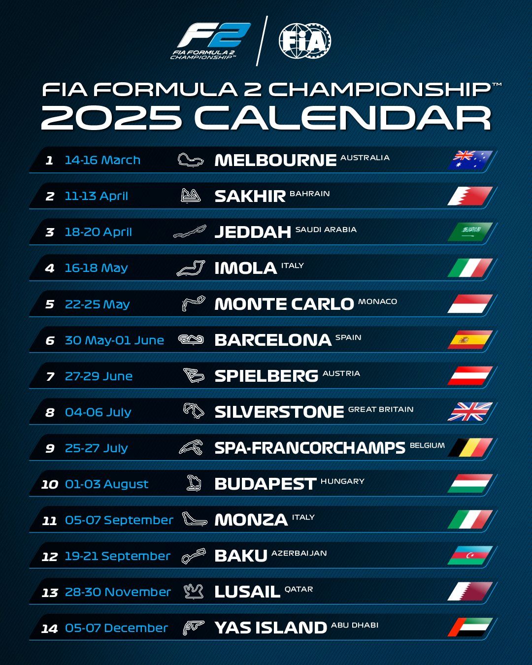 FIA Formula 2 announce the calendar for the 2025 FIA Formula 2 Championship. Once again, fourteen rounds will make the new season, all support events of the FIA Formula One World Championship, with a total of 28 races across 13 countries. The ninth season of Formula 2 will open in Melbourne at Albert Park from 14–16 March, before heading to the Bahrain International Circuit for Round 2 on 11–13 April. The following week on April 18–20, the paddock will make its way to Jeddah for Round 3.