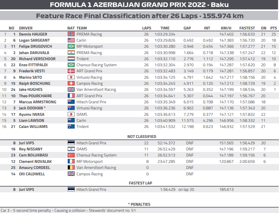 Sargeant ended up second as F2 points leader Drugovich was third to extend his lead, while Daruvala was fourth to keep his hopes alive. Doohan was fifth but a 5s penalty dropped him to outside the Top 10, as Verschoor ended up fifth.