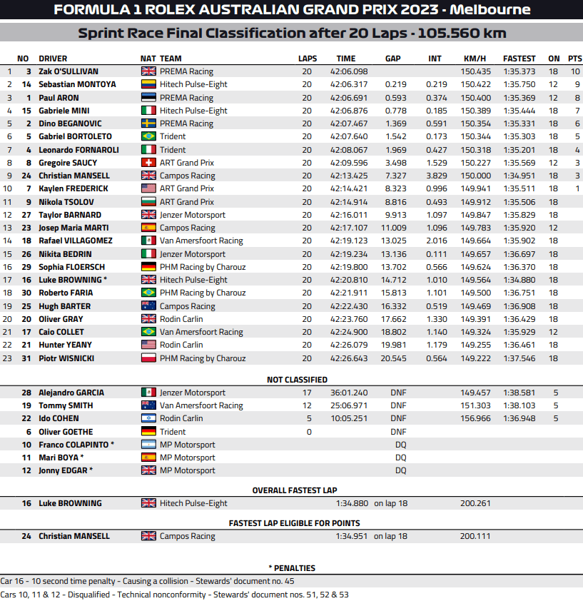 #F3 #AustralianGP Results of a safetycar filled SprintRace. #MsportXtra pic.twitter.com/jZV8AhjcCA