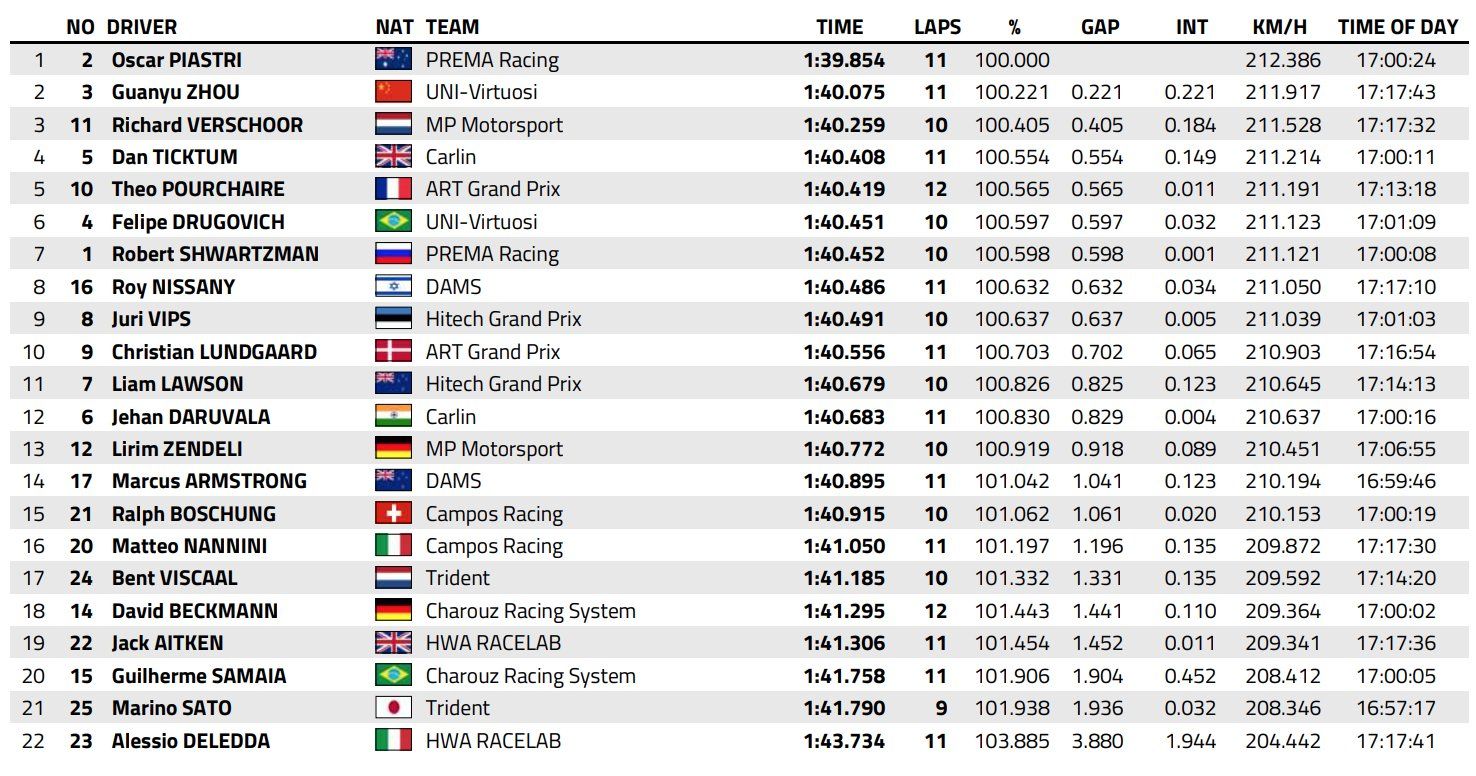 Ticktum dropped to fourth from Pourchaire, with Drugovich sixth from the spinner Shwartzman. The red flag helped DAMS’ Roy Nissany, who improved to eighth late in the session, with Hitech GP’s Juri Vips ninth and ART’s Christian Lundgaard 10th.
