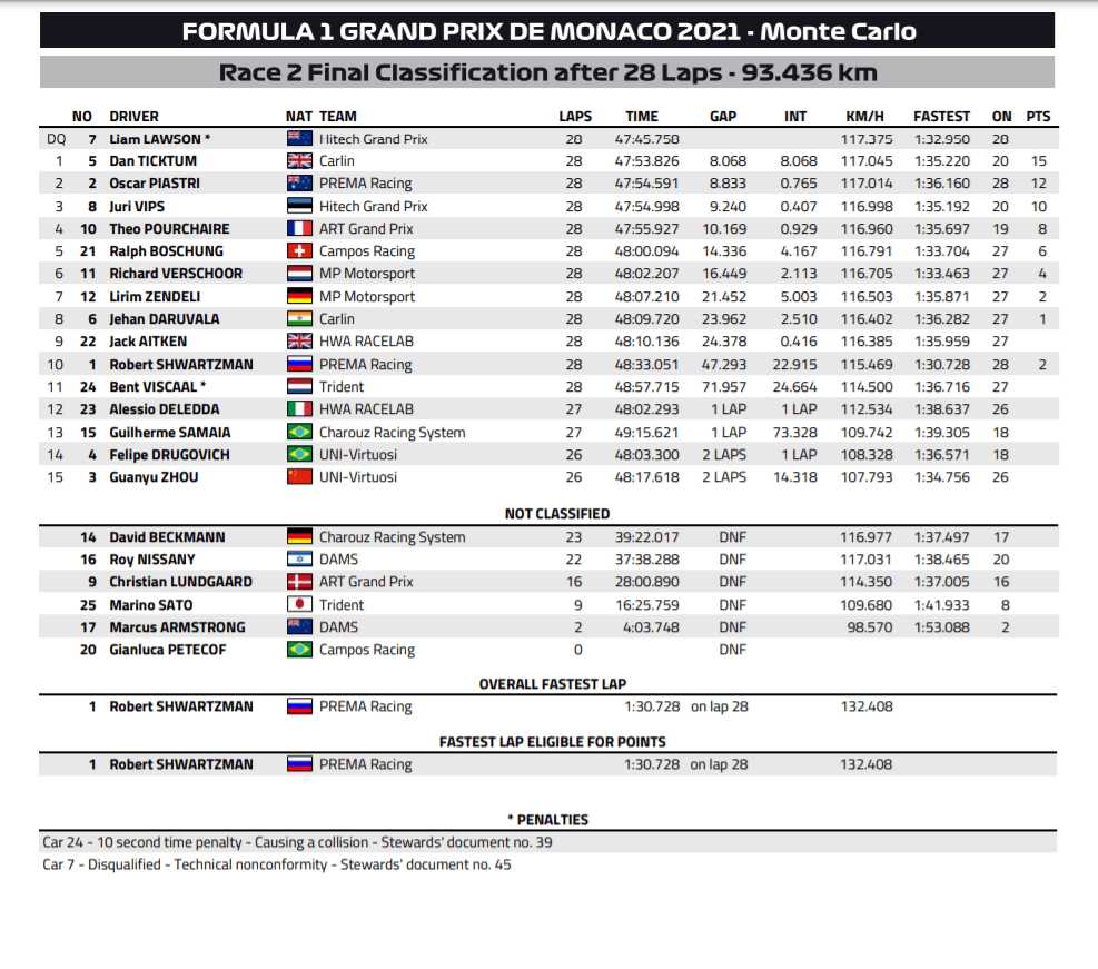 The Race 2 saw Carlin’s Daniel Ticktum win after DQ for Liam Lawson in Monaco F2 weekend, as ART’s Theo Pourchaire took the feature race victory.