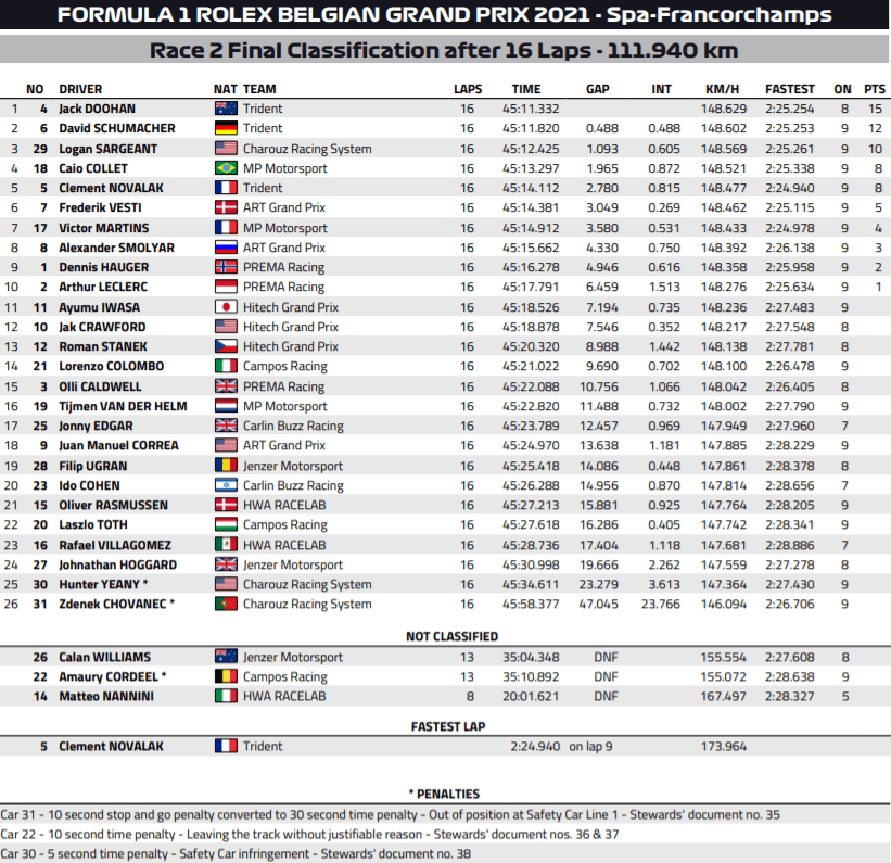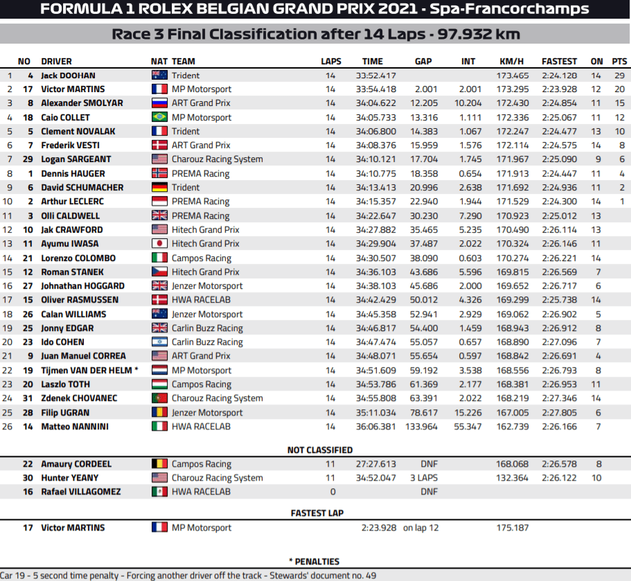 The safety car was not done yet at Spa, though, as it was deployed in Lap 14 itself. A collision at Eau Rouge between Jenzer Motorsport’s Calan Williams and Cordeel, both were okay and out of their cars. The race eventually finished under safety car, with Doohan securing his second F3 victory, and Schumacher in P2, for a Trident 1-2.