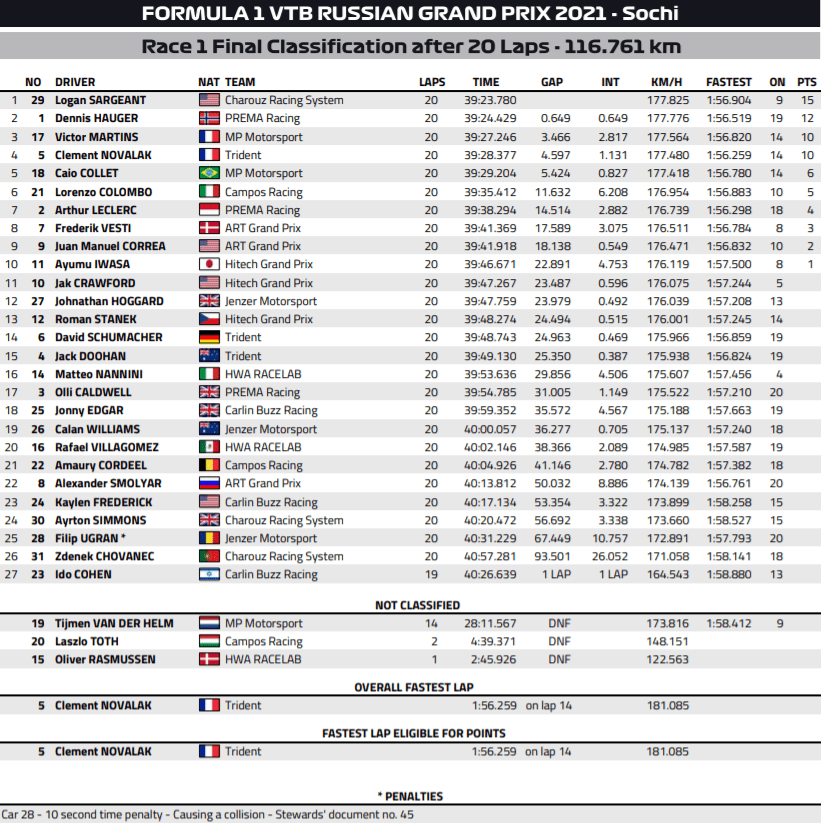 Top 10, standings: Hauger, Doohan, Novalak, Vesti, Martins, Smolyar, Sargeant, Caldwell, Collet, Leclerc.