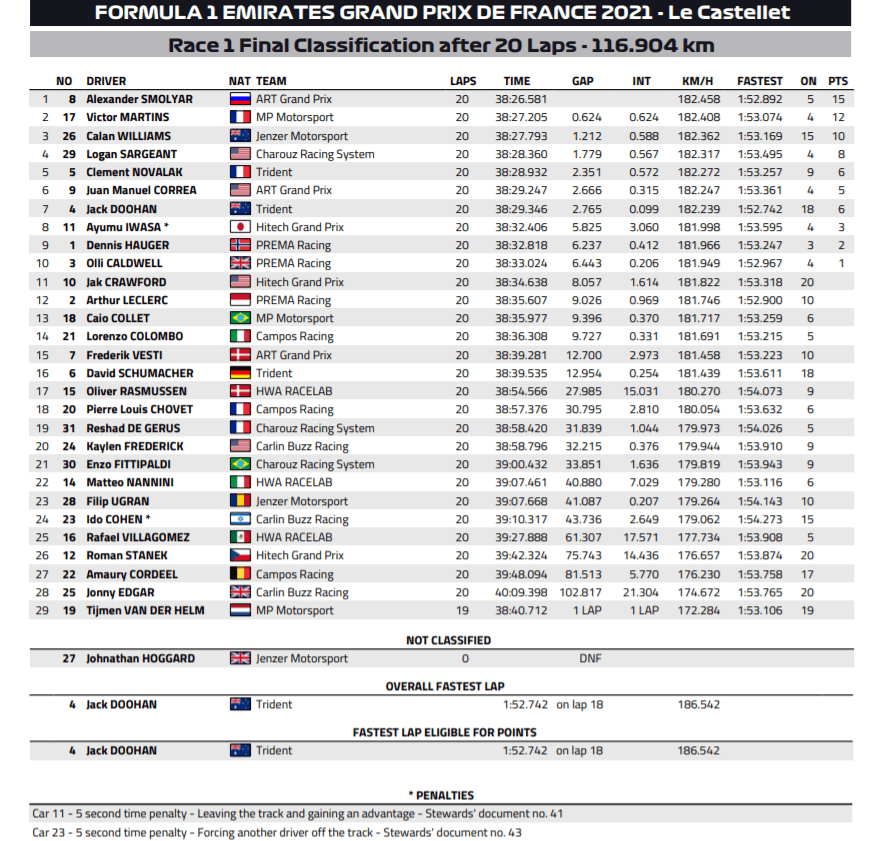 The latter was handed a 10s-time penalty for causing the collision, before later retiring. Smolyar and Calan Williams both made it past Iwasa for seventh and eighth in the closing laps, dropping the Hitech racer down to P9 at the flag. In 10th, Vesti was able to hold off David Schumacher and Logan Sargeant for the final points’ position.