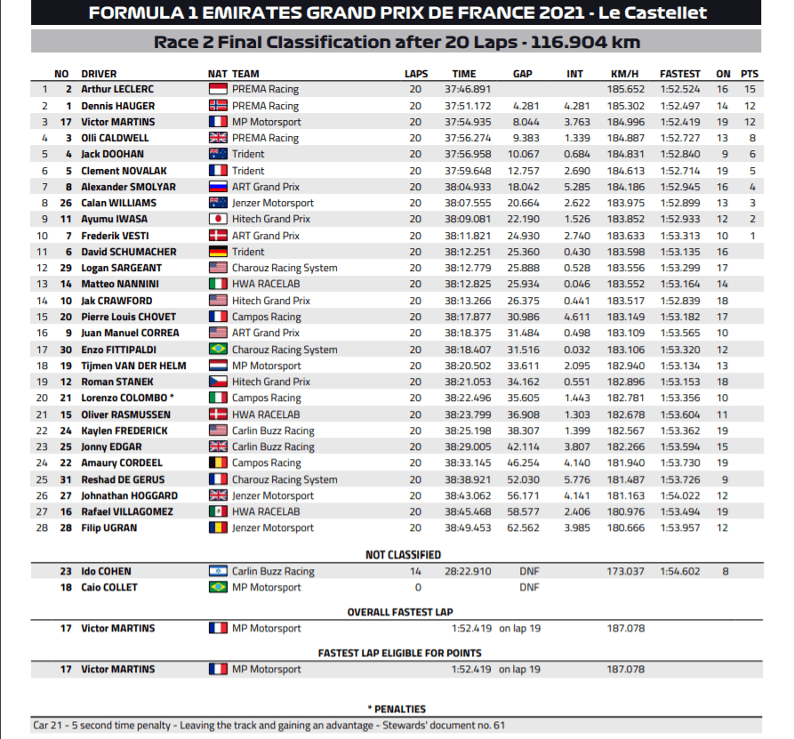He’d caught up with five laps to go and was told to go for it over team radio. Doohan needed no second invitation, launching past the PREMA down the main straight. Hauger kept on the Trident’s tail and was encouraged over team radio to fight for the position, as opposed to settling for second, but in the end, there was nothing he could do.